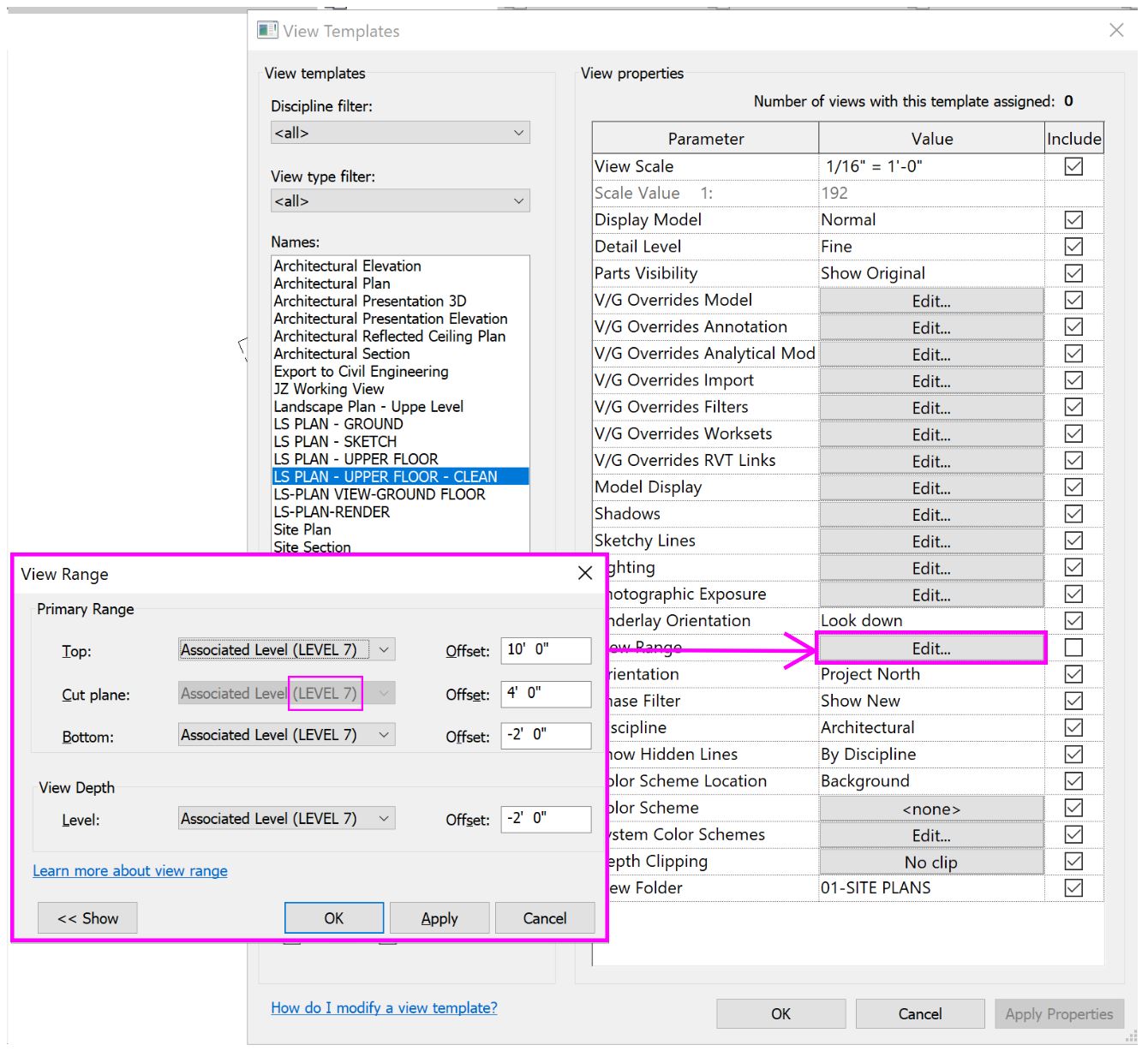 A colleague has somehow done something similar to what is shown in nlevinson's post - i.e. created a view template that has a view range associated to a specific associated level (in this case Level 7), rather than just a generic "associated level". This template seems to have the unique ability of being able to re-associate another view to Level 7 when applied as a template. I'm trying to re-create the effect with a different level, but I cannot figure out how to do it. Any ideas? I.e. how to create a view template with a view range that defines a specific level as the associated level.