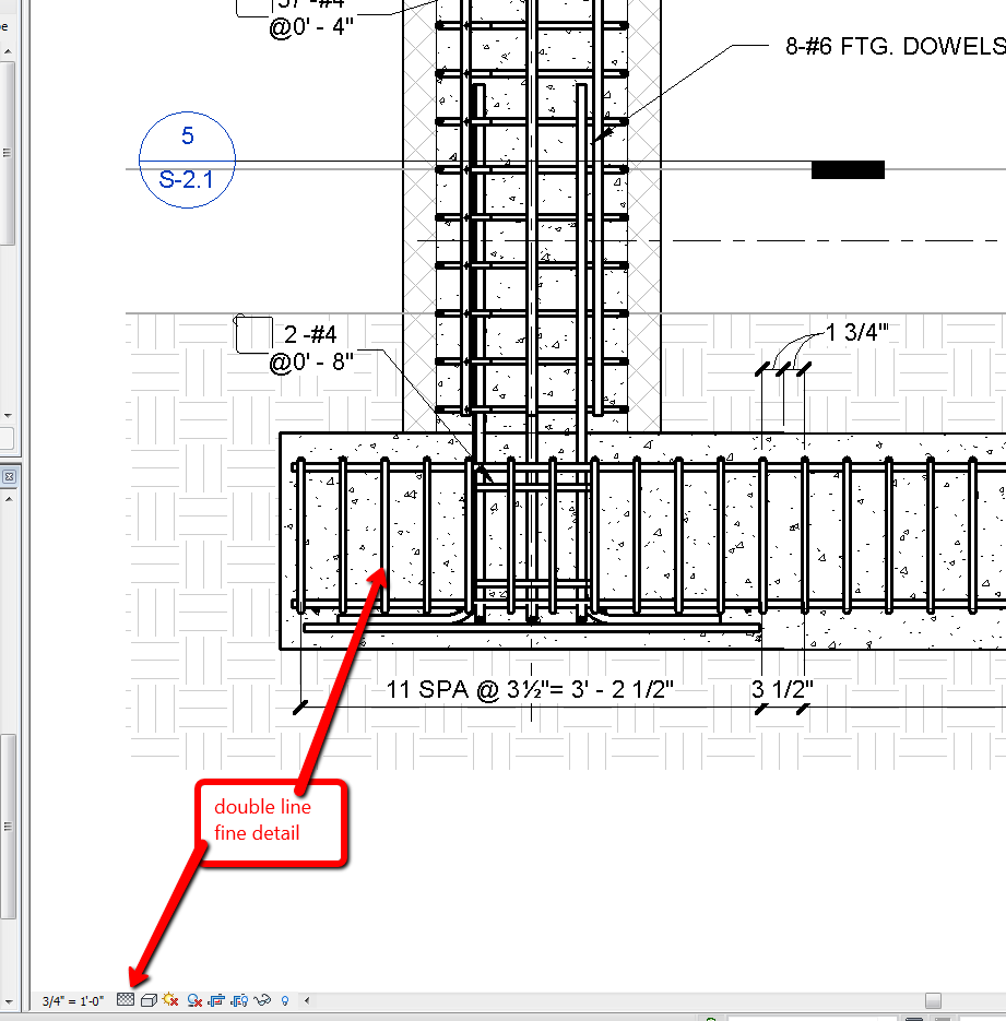 It works fine for me in RST 2011 as well. It is 2012 that is broke. Here is the same detail I showed earlier in RST2012. This is medium detail. The only thing I did was to open the file in 2012. This really screws up my older projects. The rebar at 3/4":1'-0" is too busy for double line but you lose all of the structural steel beams and columns if you use coarse detail.