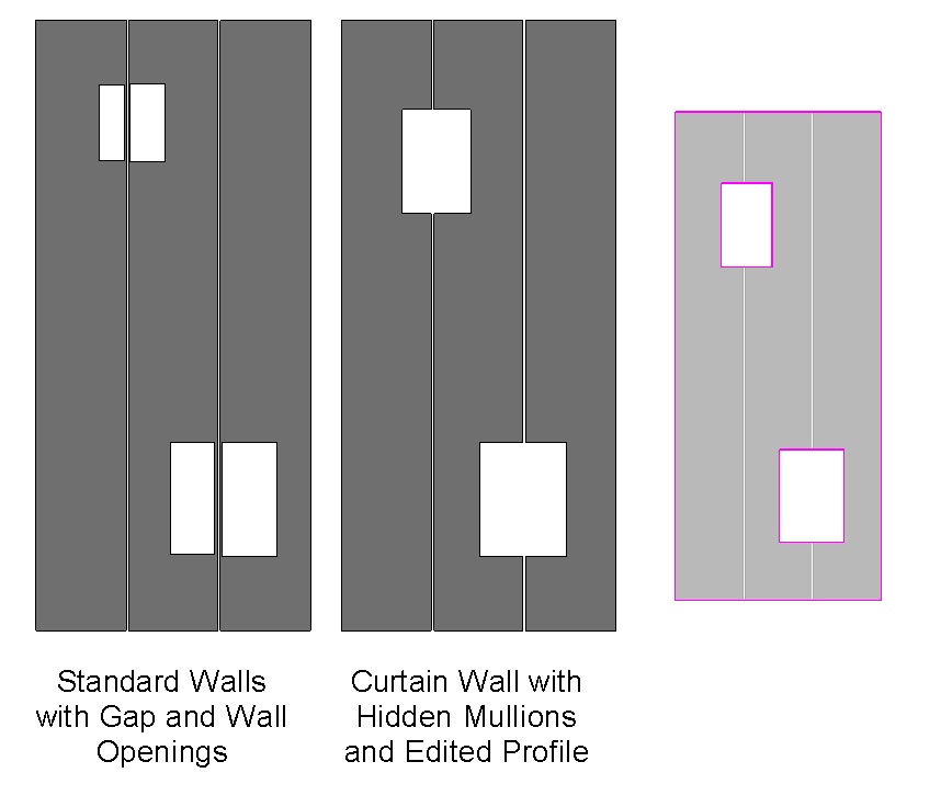 The other problem with using the curatin wall is the placement of any openings like doors. You have to add curtain wall grids and adjust them to create openings. Doors / openings that cross multipanels are a problem for the same reason.