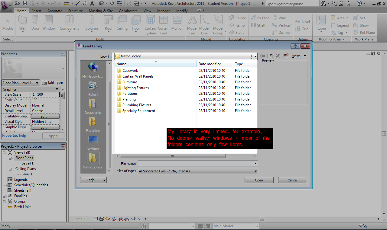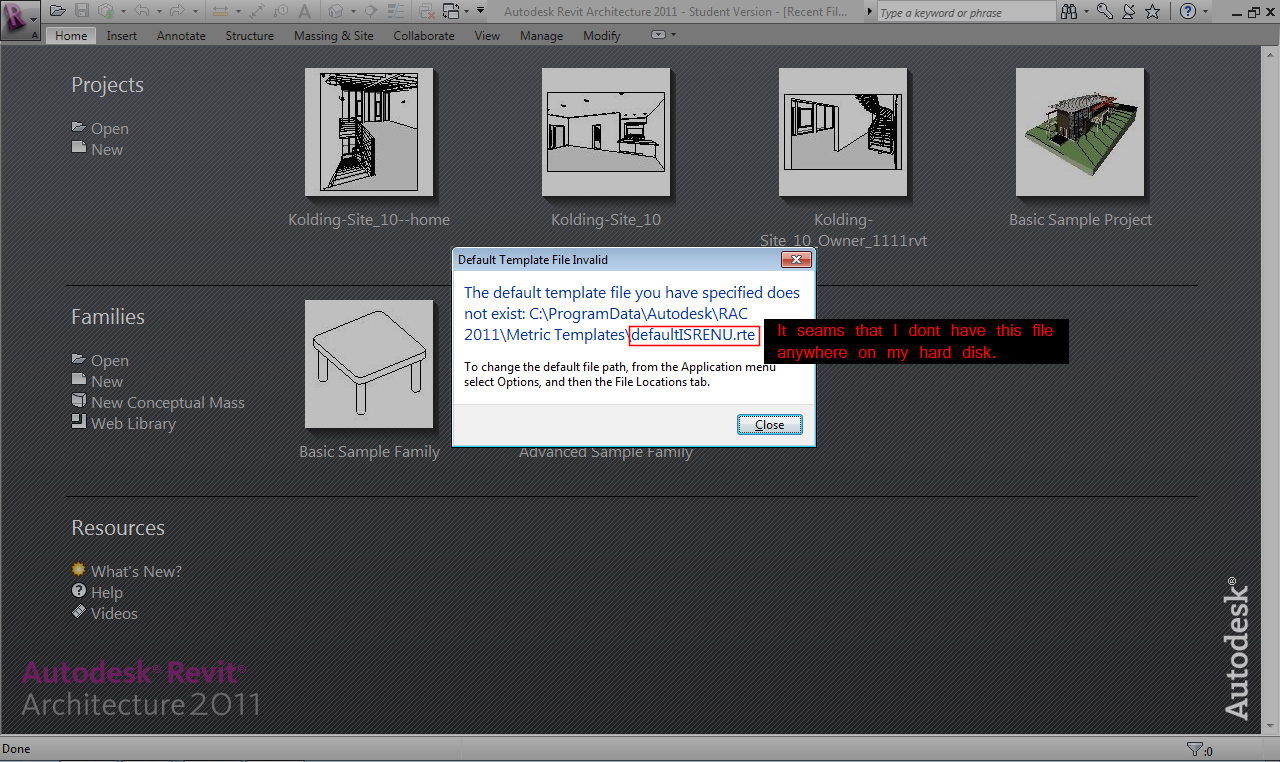 My educational version of Revit Architecture 2011 has a major problem since it was installed on my computer - basicly it seems that I've got no libraries or templates installed.