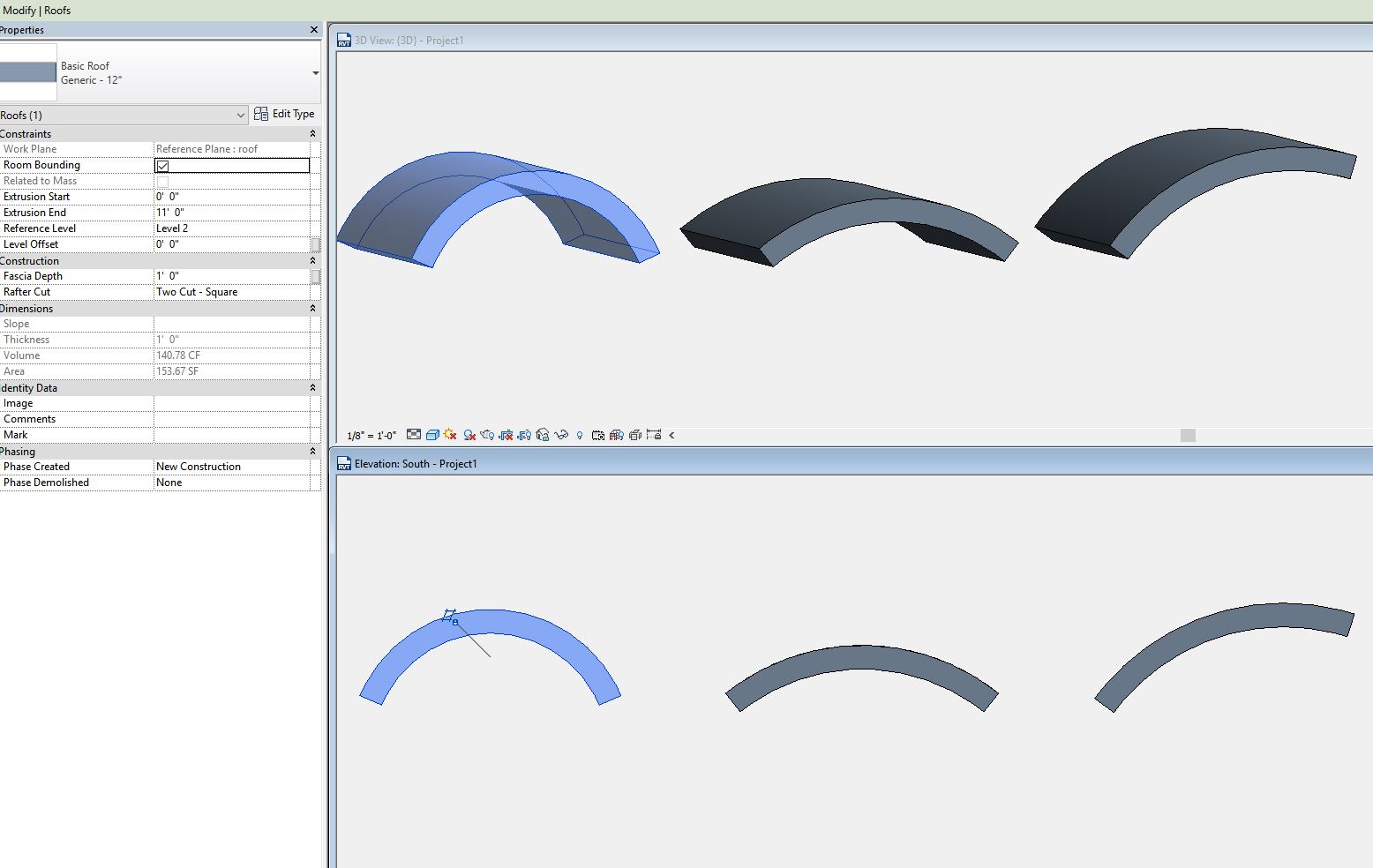 We're working on a project with a butterfly roof (see image 1) and are finding it impossible to create a roof by extrusion with square cut rafter ends. Normally I would use a roof by footprint, but since our roof pitch varies depending on the width of the building, the roof by extrusion would save us an awful lot of slope calculation and other inaccuracies. I've tried to fix this by setting the facia depth to match the roof thickness (this works perfectly in a roof by footprint) but it remains plumb cut (see image 2).