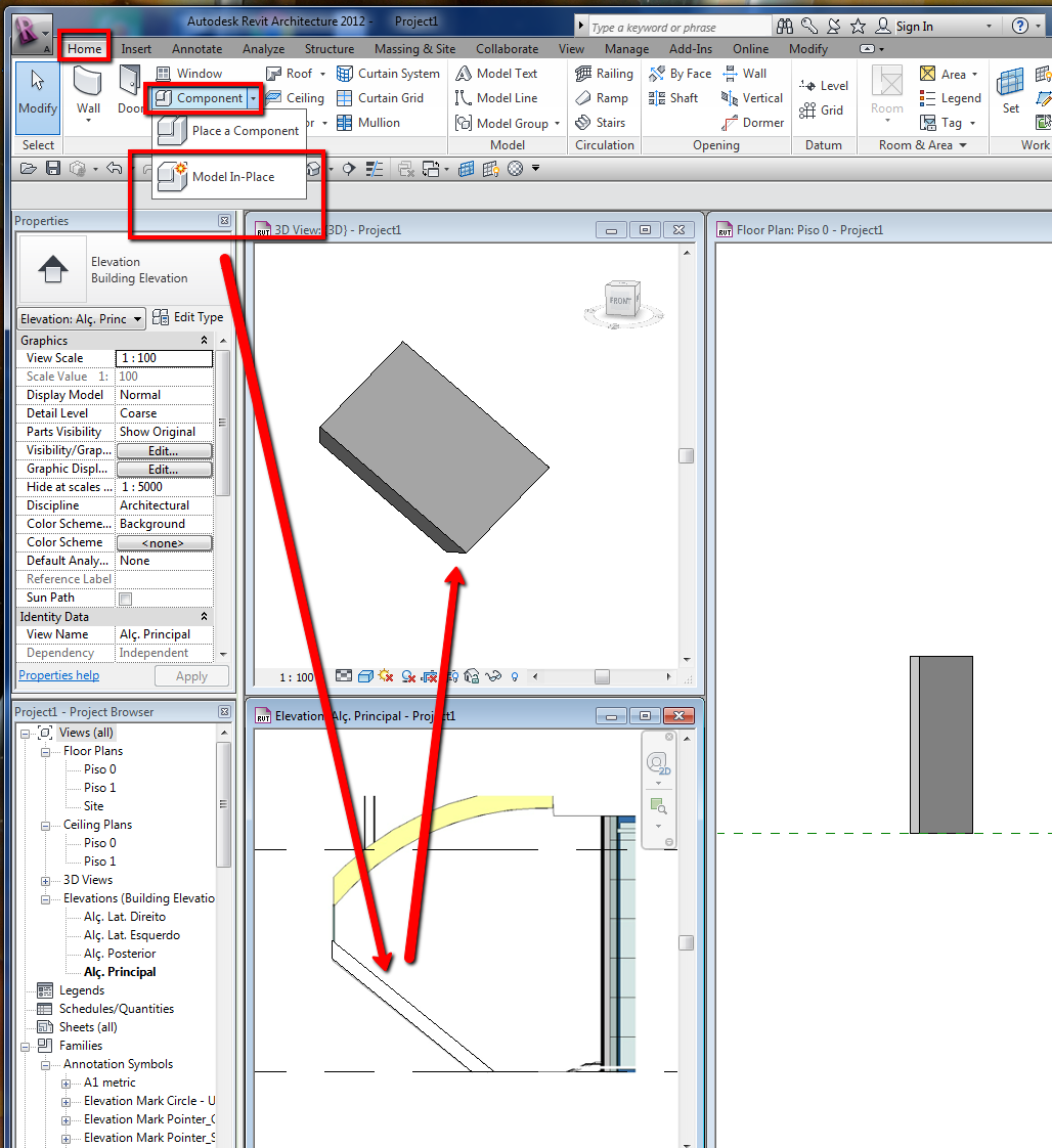 2. Home > Component > model in-place, select "wall" category and create the wall with "Extrusion" OR you can create a "Mass" and then use the "Wall by face".
