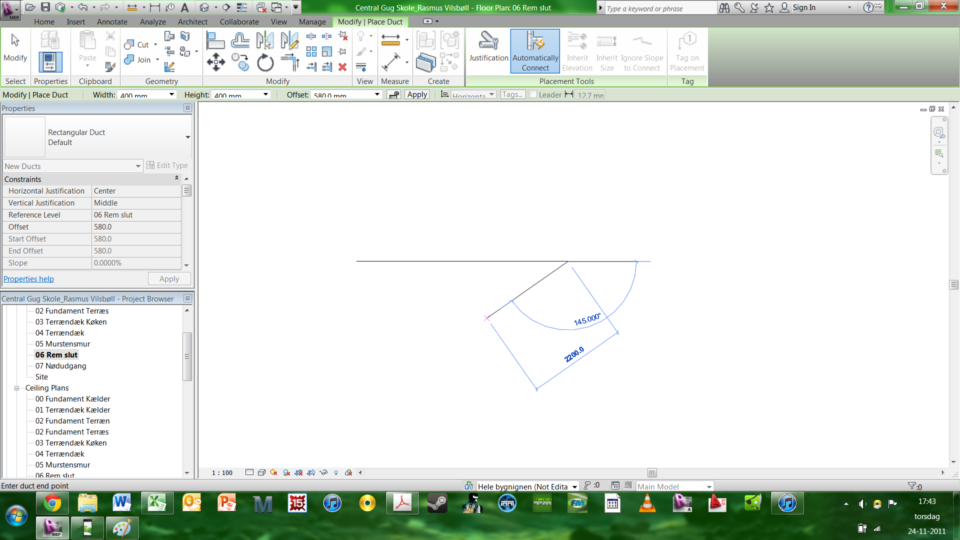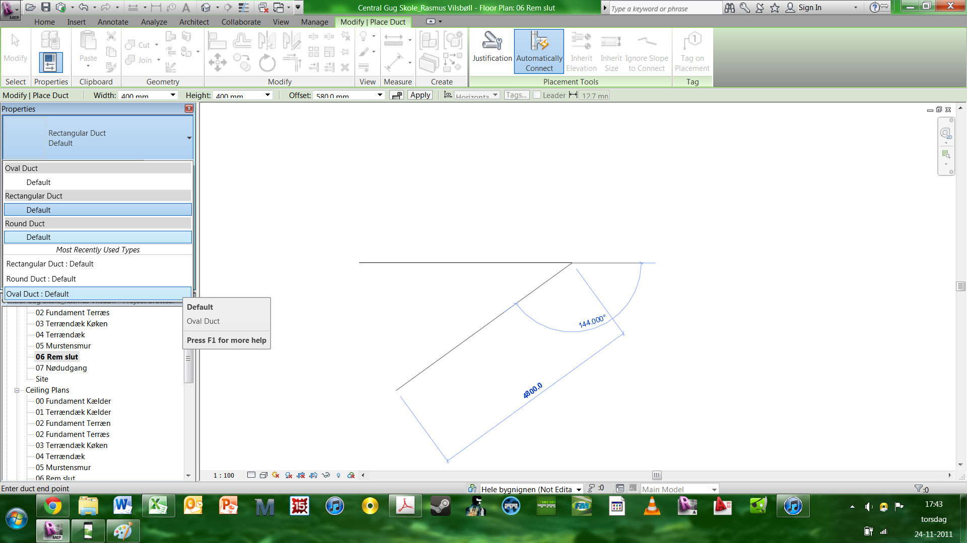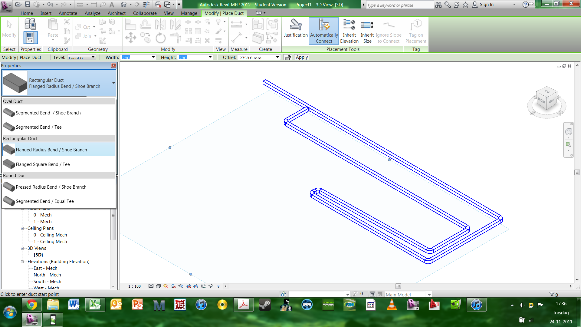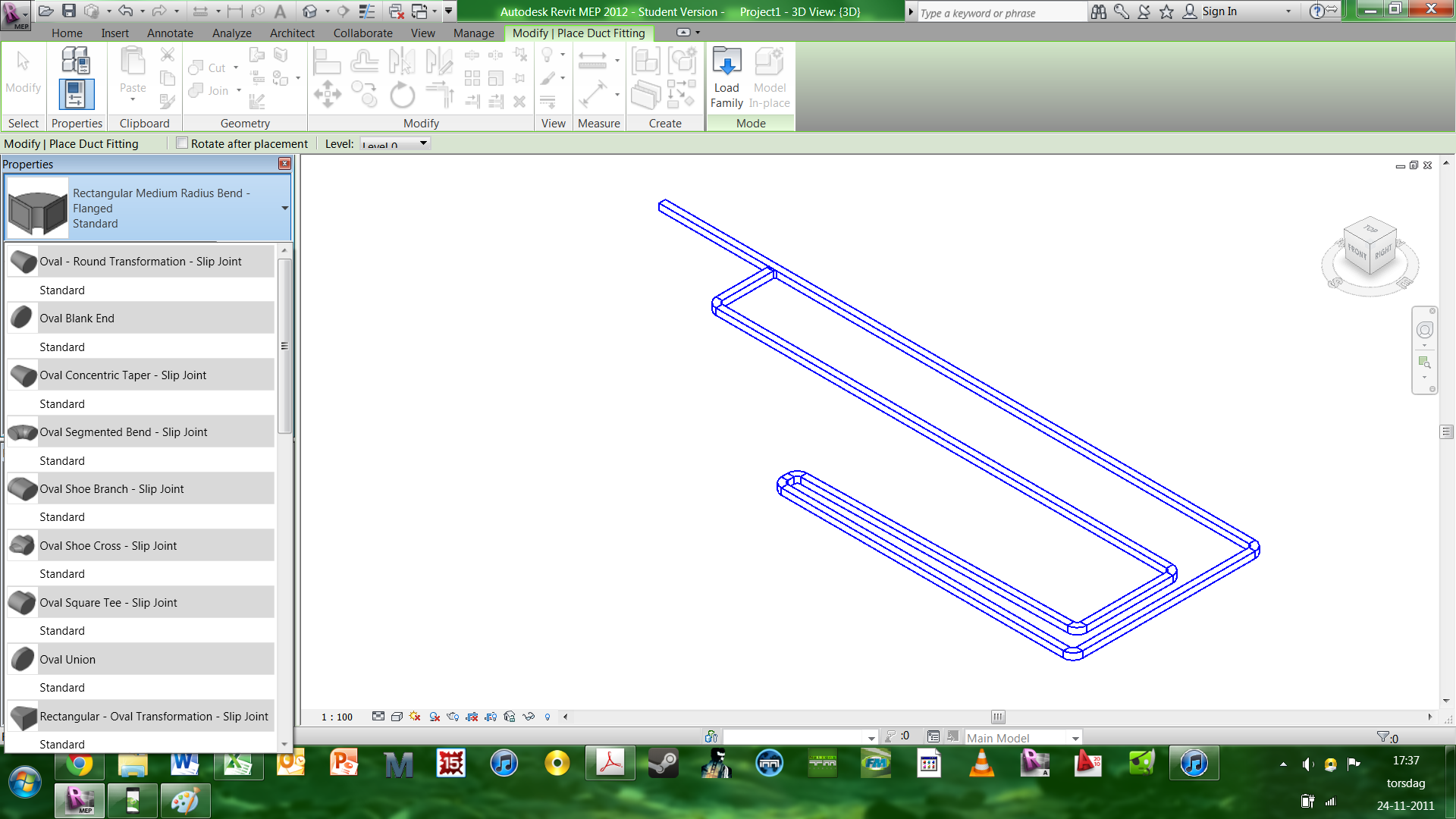 My partner has created a building in Revit Architechture 2012, and now I want to draw the HVAC systems for the building, but for some reason, all the standard ducts, air terminals and duct fittings are not loadable in this project, despite it being perfectly usable in a "new" project. This bothers me a lot since I can't make a continous ventilation duct, but has to draw every bend and tee individually.