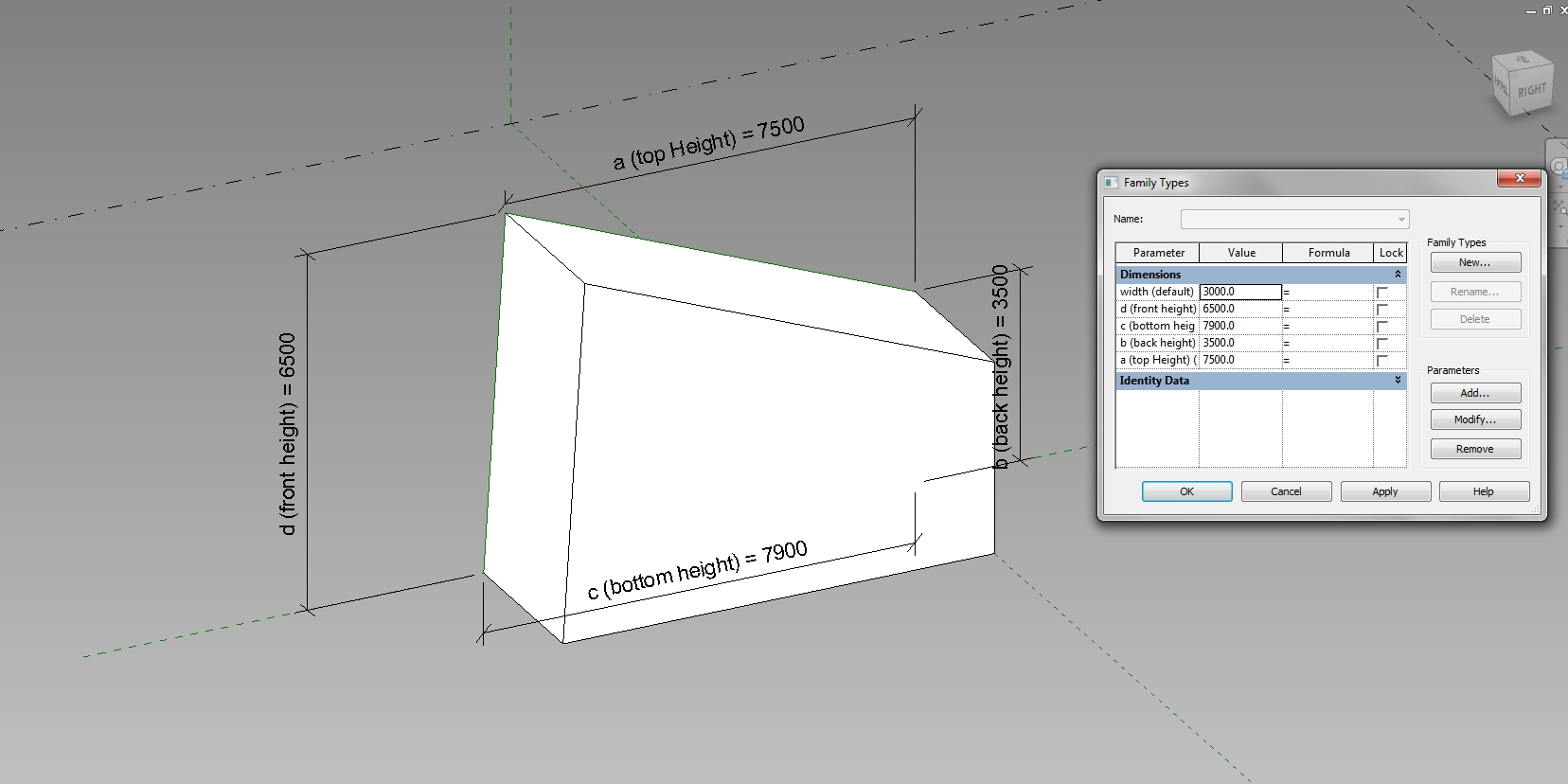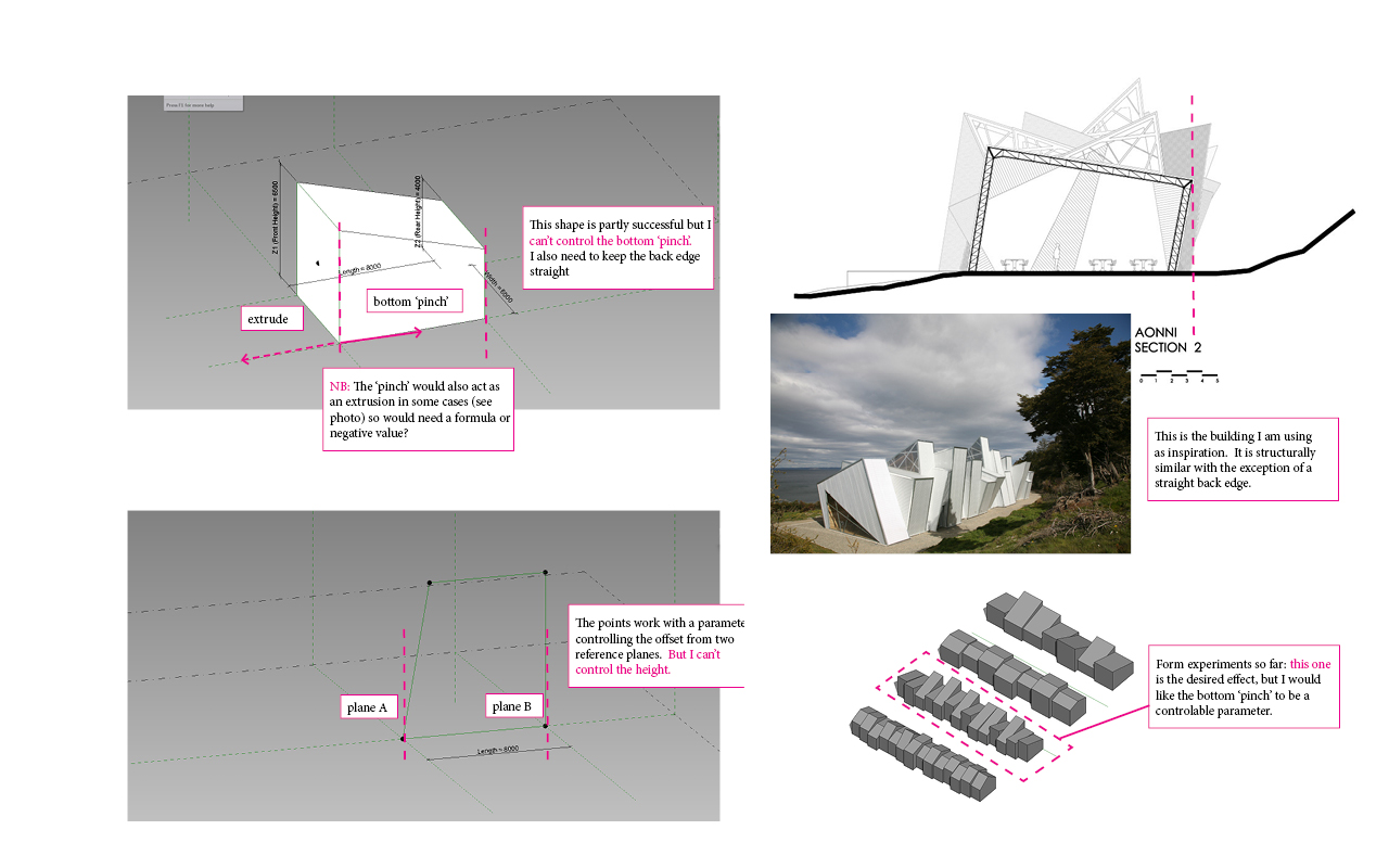 Hi I'm having problems modelling an uneven quadrilateral (see attached img for details). I am trying to assign a parameter to control an edge, but run into problems every time. I am admitedly - a little new to conceptual mass moddelling. I'm creating a new conceptual mass, choosing the Metric Generic Model Adaptive template, then attempting to draw the profile and either loft with a double on seaprate reference plane or extrude it - neither is successful.
