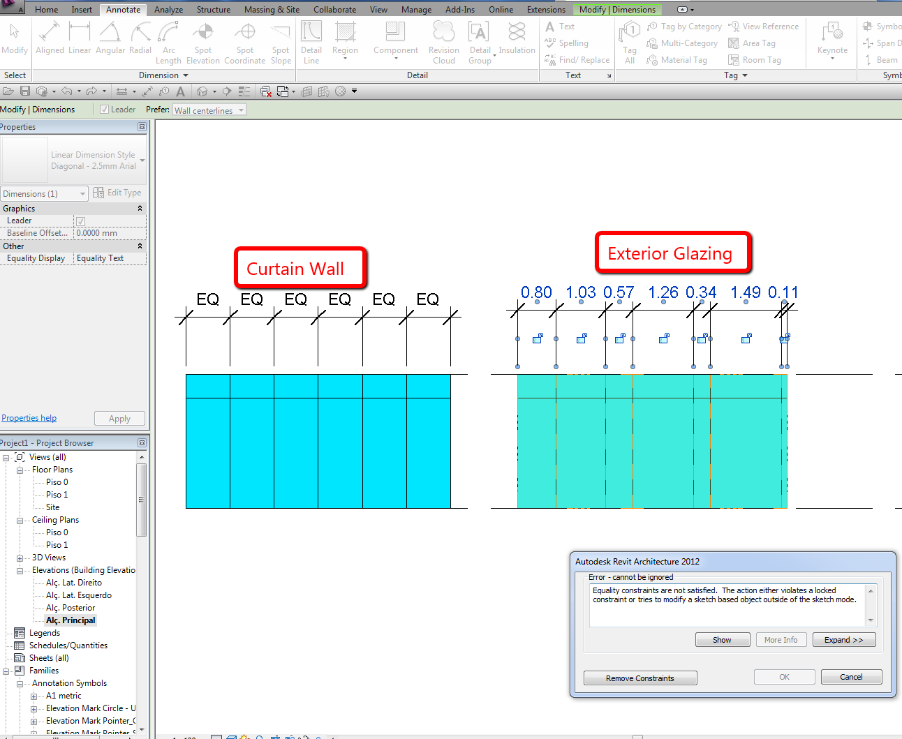 The second query I have relates to the grid of the curtain wall. I've tried it using both standard Curtain Wall and Exterior Glazing. I've attempted to add divisions to the glazing, and then to Equalise using the Aligned Dimension tool. But I keep getting an error relating to constraints (see attached picture). I've tried "Remove Constraints" but it doesn't seem to do anything.