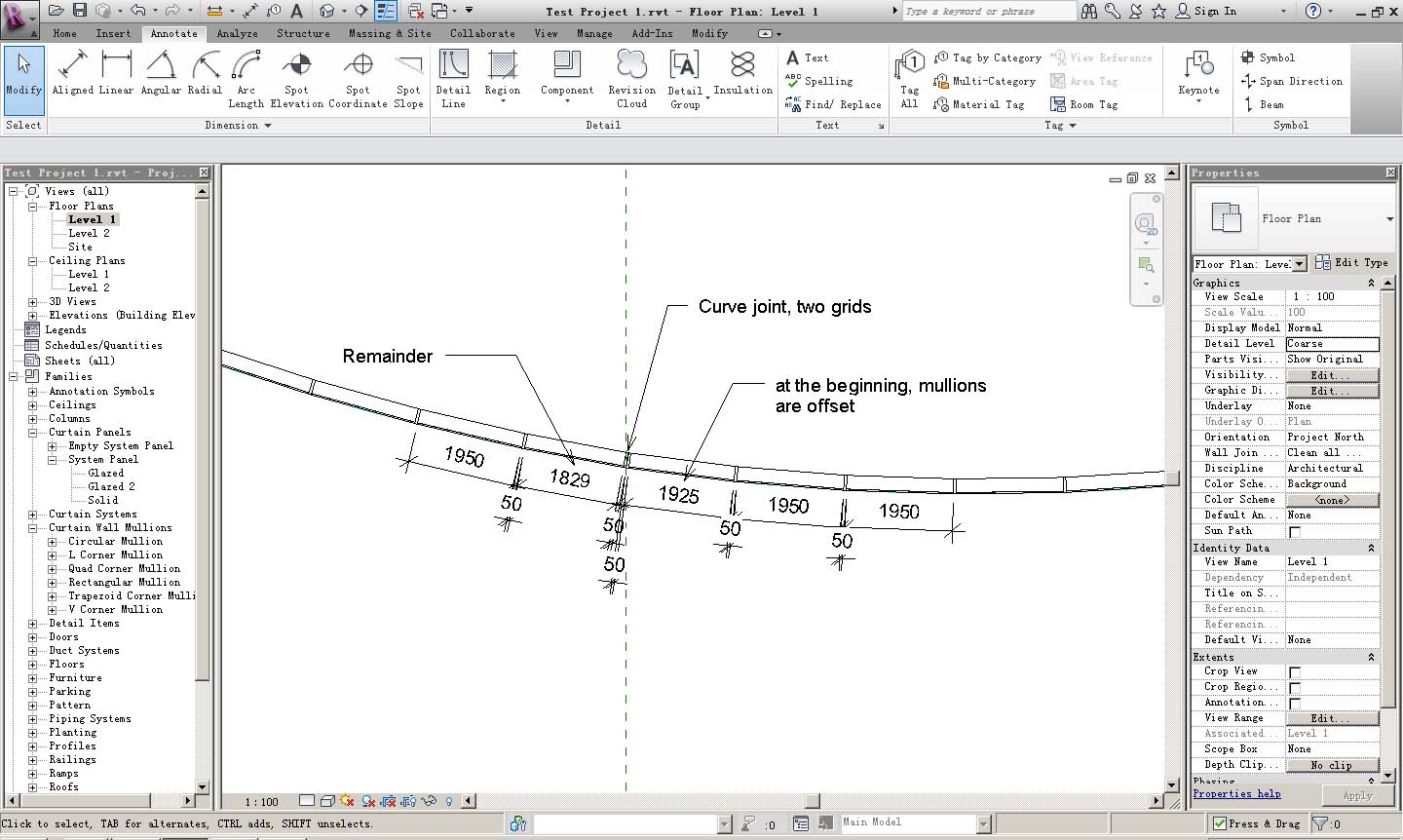 However, when I started modelling in Revit, I found out it is not that simple. Because Revit don't know polylines, it can only recognize each curve segment of the polyline I imported from AutoCAD as a single curtain wall. Therefore, it will automaticly generate a grid for each curved curtain walls at the joint, which is considered as the beginning and end of the two adjacent curtain wall systems, and the remainder of the other curtain wall grid will also be put there (shown in Pic1). And obviously this is not what an architect would want and how curtain wall is constructed.