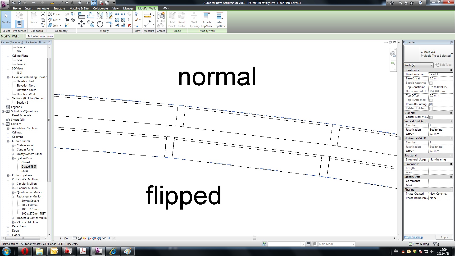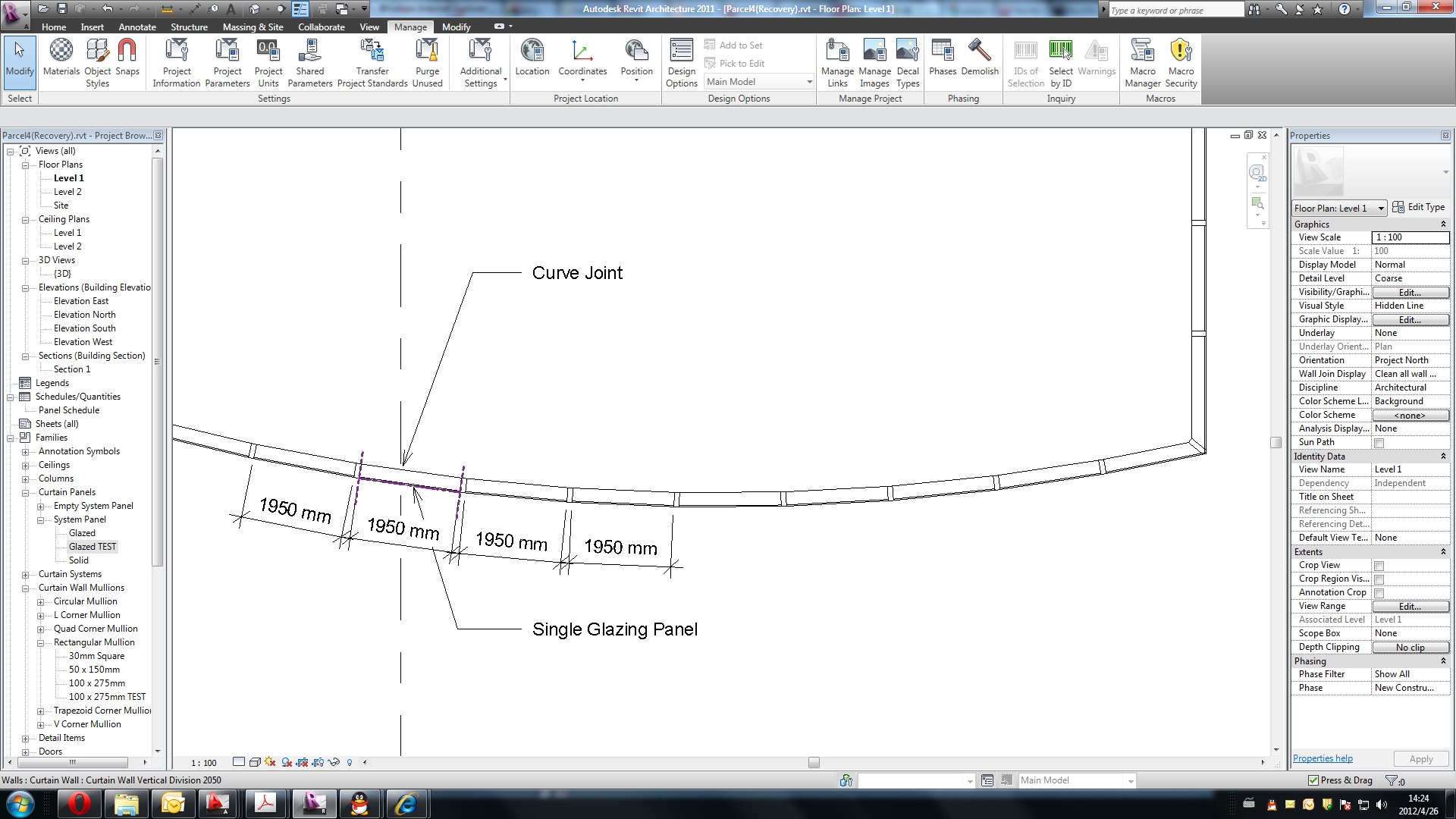 Hi, Typhoon,thanks for the creative method u showed us, quite effective for solving the graphic problem. However, if the panel is using a wall type, all the panels between the mullions will be curve shape, instead of regular everyday glazing. And whats more, when I think about this graphic problem, I realize actually this line in reality should exist if we are strictly using the curves as ours CW location line. So still want to use system glazing panel, I find a way to achieve what I want.