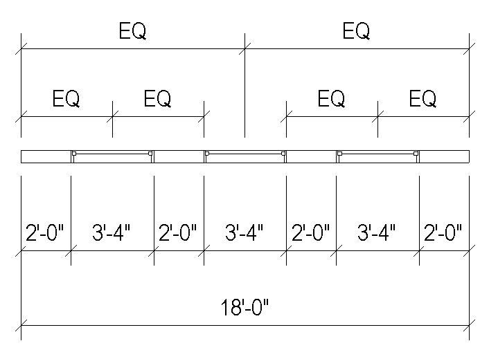 Question, if i have an 18' length of wall and 3 3-4" windows how would i set the spacing between the windows to be equal. this would be a masonry wall and the result is 2' between. i can do this in my head just fine and move it to the correct spacing, i cant seem to get revit to adjust the spacing on its own. i think it is because the dims of the windows are fixed(ie 3'-4" per the family) and it will not equallize them by clicking the eq symbol on the dim string.