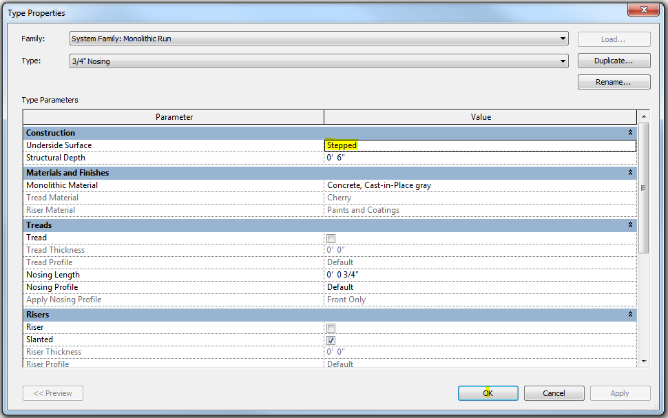 But make sure that the Structural Depth is not greater than or equal to the total of tread depth plus nosing length (unless nosing length is 0", then you can set it to whatever depth you want, if you want stairs to appear as solid block of concrete).