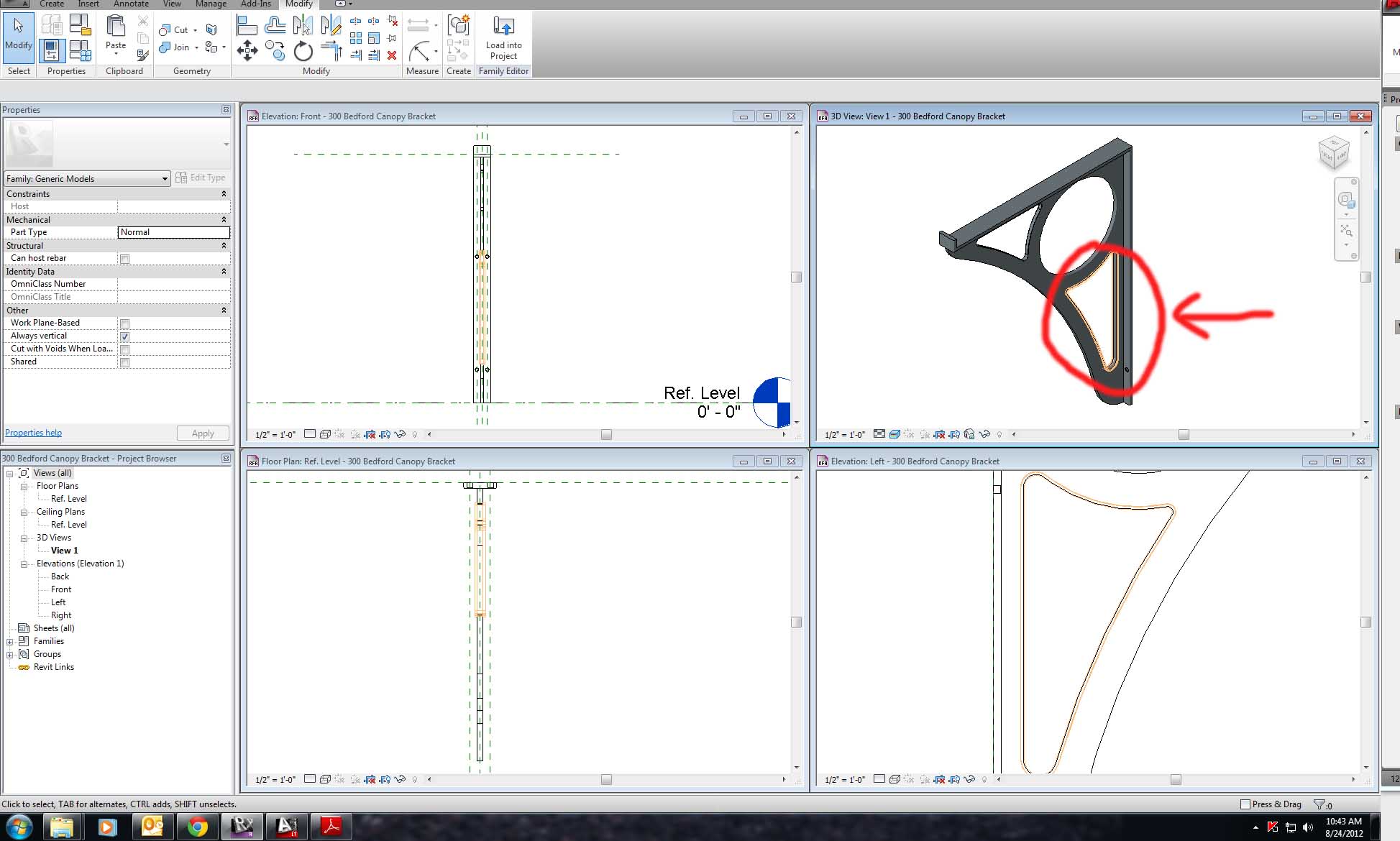 I'm working on modeling a solid cast iron bracket with different shape cut outs in its side elevation. I created an extrusion for the body of the bracket and used a revolve, sweep and extrusion in void form to make the cut outs. The last void sweep is giving me problems. Every time I try to cut the geometry I get the "Can't keep elements joined" error message with no further detail. I have attached the family file for review. Any help would be much appreciated.