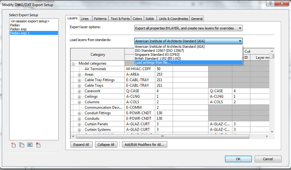 exporting to dwg - load layers from standards |