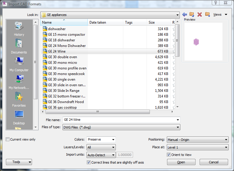 when importing you must specify where you want the object to end up. Note positioning, make sure you are in plan view, at the correct level, and I almost always use Manual Origin. I placed this wine cabinet in plan and then switched to 3D view.