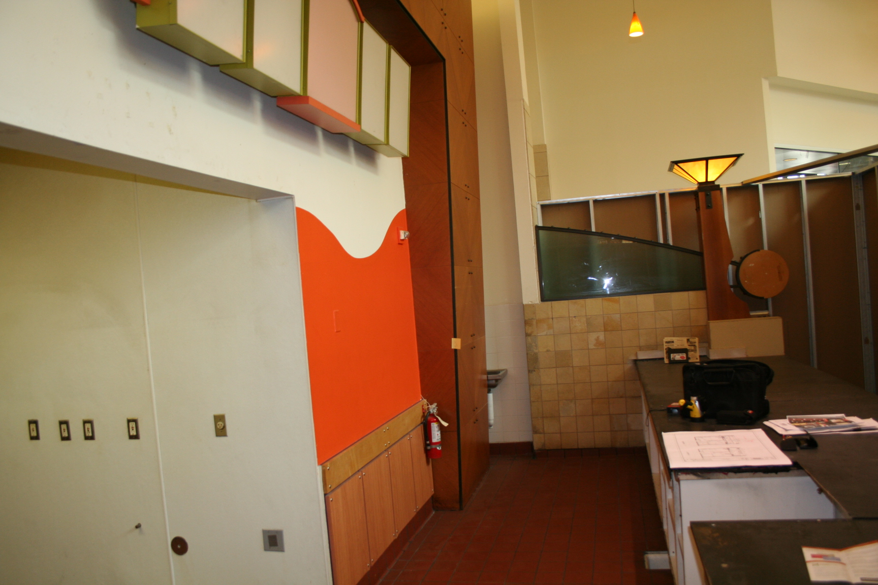 solid walls transparent to curtain walls and railings in back.. |