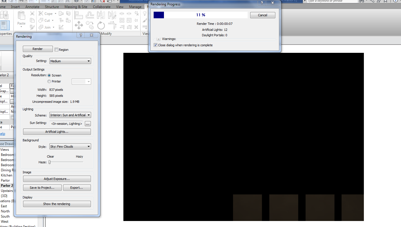 When rendering the inside of the house (here I'm trying to do the Parlor), I have "Interior- Artifical and Sun Light" selected, but the dialouge box that comes up states that there are "No sun light portals" even though there are a couple of good sized windows in that room. The windows appear grey in the renderings, as if there were painted. (They are just stock Revit windows) Do I need to designate them as "sunlight portals?"