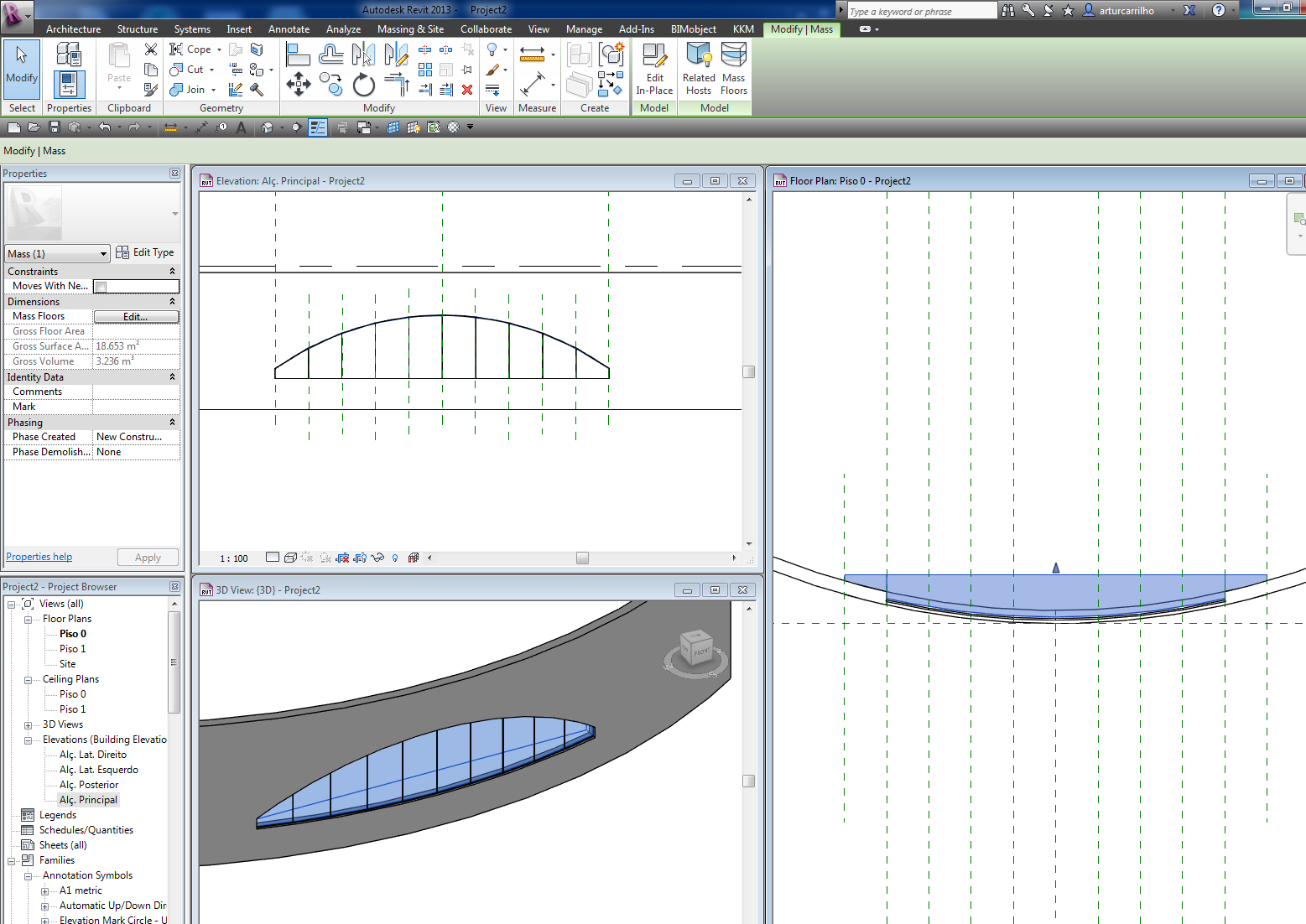 2. One rectangular mass that follows the footprint of the wall and then one that is drawn in an elevation workplane using the "Draw Lines on Face" command. This seemed to create the arched portion of my window in a radius to match the wall except that I received this error: "The mass contains geometry that cannot be combined. Mass floors, volume, and surface area won't be computed." In this case I cannot select this face to attach the storefront wall.