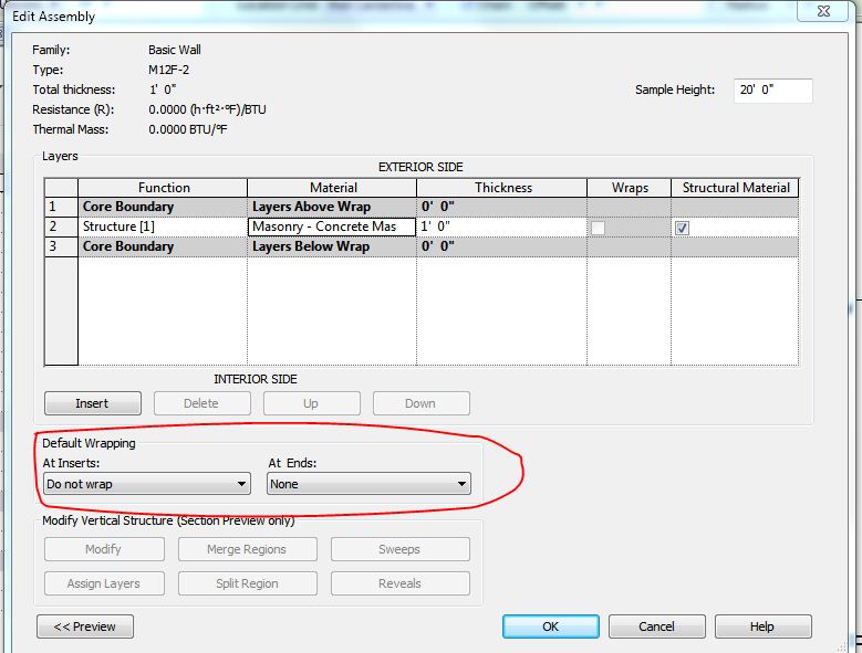 Click the wall command and find one of the walls that makes up your stacked wall, for example you have CMU on the bottom and brick on the top, find the brick wall, click on it and on the Properties Pallet click Edit Type, then edit structure, then change your default wrapping.