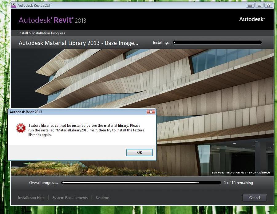 During my installation when it is almost done a message pops up that says "Texture libraries cannot be installed before the materials library. Please run the installer, "MaterialLibrary2013.msi" then try to install the texture libraries again." I have run the msi installer and I have a materials library listed in program manager but it still gets the same error message and failed install again. I have windows Vista. Can anyone help?