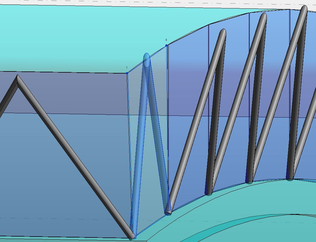 I've got a conceptual mass with a curved profile face that I've divided with a basic vertical grid (no horz). I've build a custom pattern-based curtain panel family that is simply a pane of glass and a triangular roof strut leaning away from it. I can apply this fine to the face, but the final panel doesn't work, it insists on adding a subdivision (I assume because of the inclinded edge. So I deleted the final panel and then manually placed an instance of the same panel family, clicking on the four vertices of the pattern. This almost works except that the triangular strut is flattened down on to the glass.