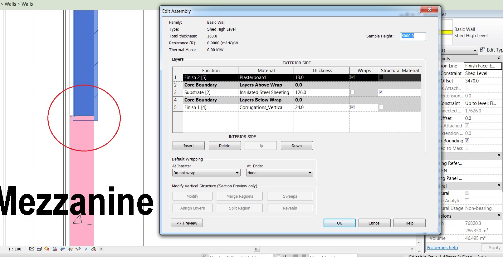 I’ve made up the two different wall types, and have one sitting on the other (attached section shows makeup of the framed wall) however I’d like the external corrugated iron cladding of the lightweight part to overlap the concrete for waterproofing purposes.