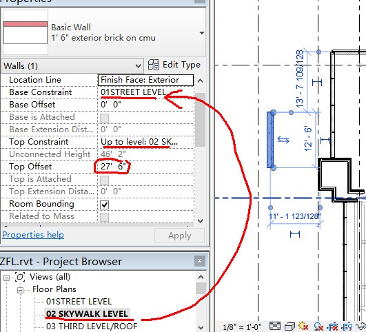 See the picture, I drew on 02 skywalk level, but the wall properties shows the bottom of the wall is on 01 street level. the top offset is 27'6"