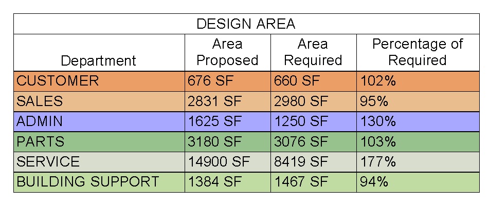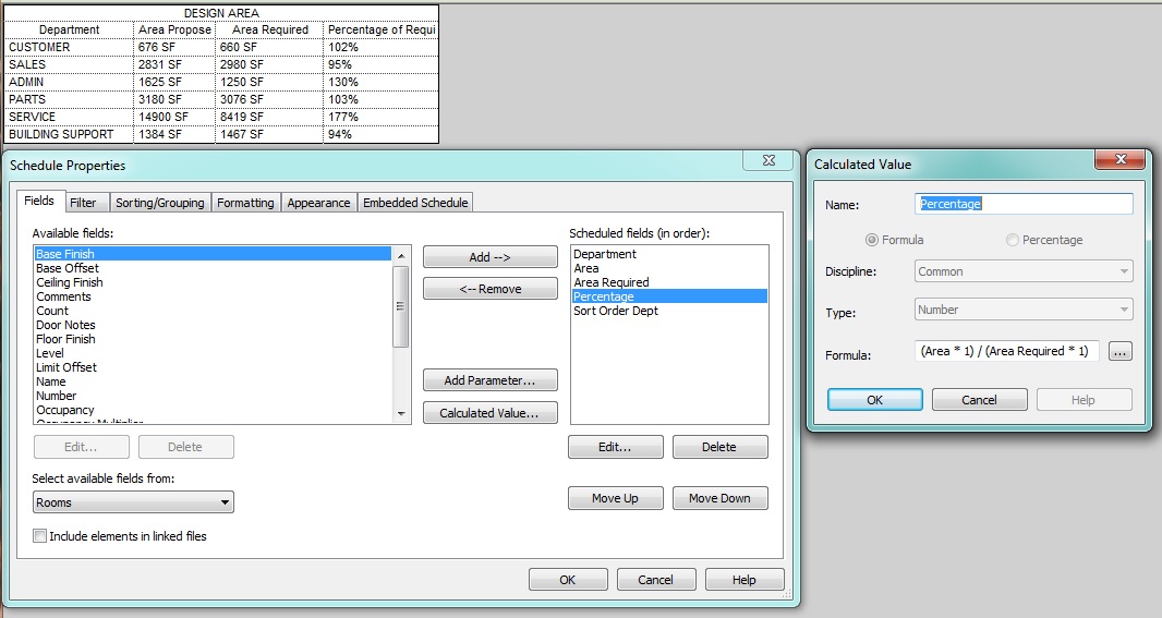All I want to do is compare that total area by the required area and show a percentage. (wherther I'm at 70% or 110%). I can do it for each room individually, but not by total for each department.