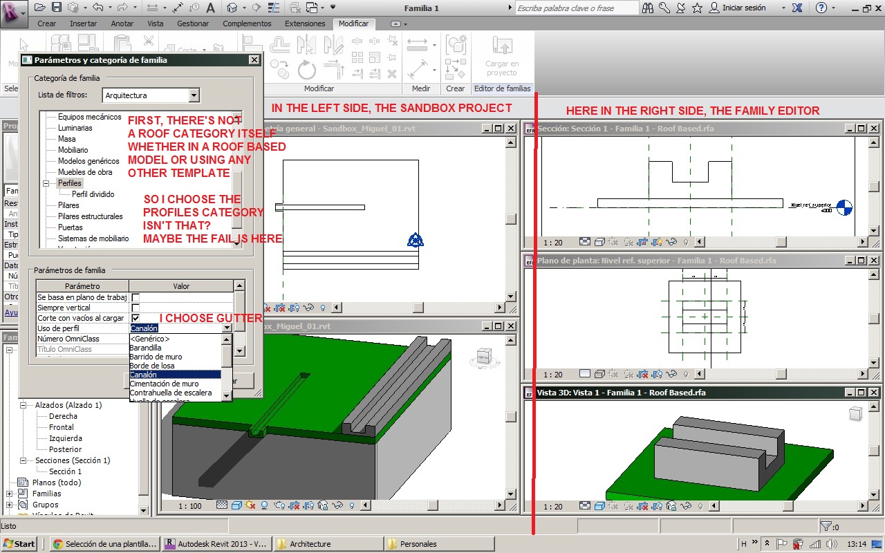 - The problem is that I don't know which Category to assign, since there's not Roof Category for User Component Families. The one that sounds better is Profiles, and then choosing Use: Gutter. But when I do that, I can't load the Family anymore. Note that later I have to make the Quantities of the project, so I can't leave it as Generic Element (I suposse).