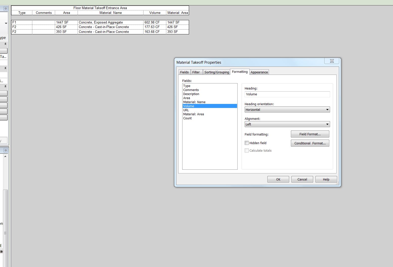 Sorry if this is a repost but I've created a material take-off for floors. And unless I itemize every instance I get no value under area and volume. When I go to the format tab "calculate" totals is greyed out. I've attached a screenshot. All I want to get is area and volume listed with having it show an area for each floor.