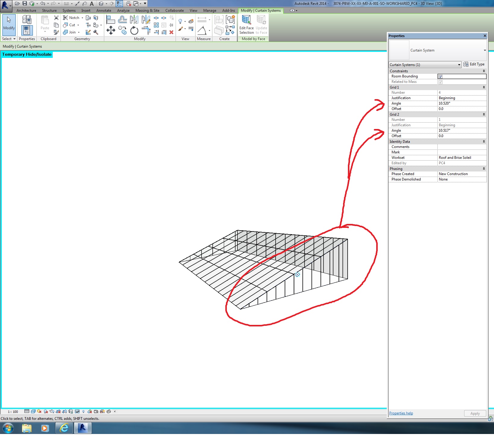 I have modelled a roof light for a large commercial building. I am able to edit the angle parameter in the properties window for the 3 vertical elements of curtain system, however, I am unable to do the same process for the sloped element and as such, am unable to manipulate the grid to appear how I would like it to.