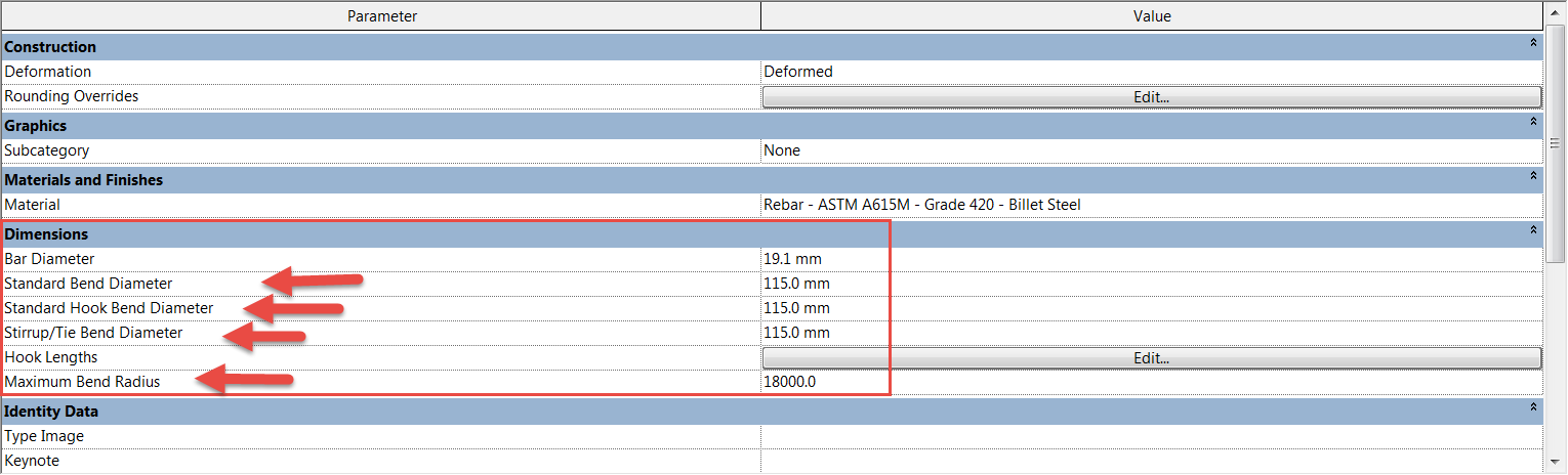 2 - in case of changing the bar diameter, have i change the dimension properties (standard bend diameter, hook bend diameter, stirrup bend diameter & maximum bend radius) like in attachment no.2? & is there any available bar diameters types like 18mm, 20mm with complete properties.