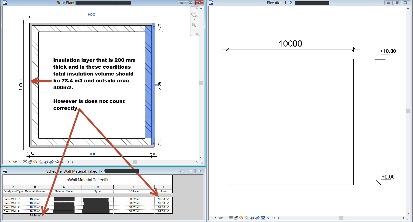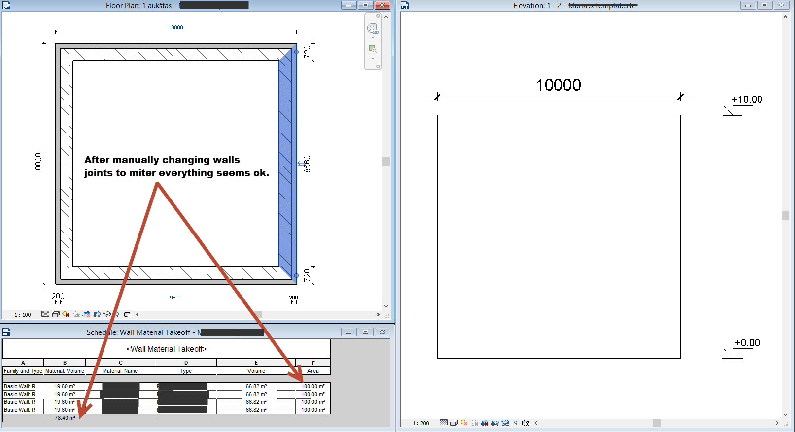The reason I am asking you is this. At the beginning I thought that if I draw a cube from walls that is 10units*10units*10units and from the 4 sides would add 0.2 units material thickness, I should get 81.6 units3 (8.16 units2 * 10 units). I made area calculations in autocad. However, by default, without changing wall connection type, in material schedule I get only 77.44 units3 of material. So I am missing 4,16 units of materials.