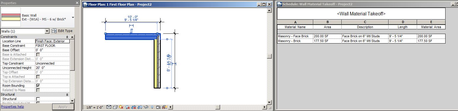 · View 1 – The material areas for the exterior brick is correct for the two walls. (Note material name for vertical walls are (2)) The takeoff accounts for the material thickness.