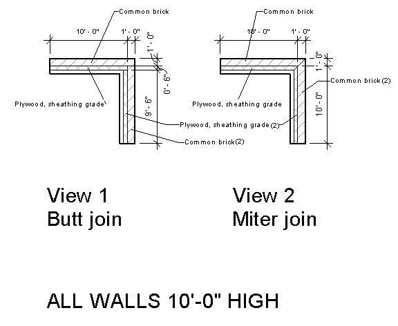 In the first image, I used the standard joint. Note that the brick area and the exterior wall face area are the same for the individual walls but they are different from each other. Why? The thickness of the brick at the corner is subtracted from one wall.