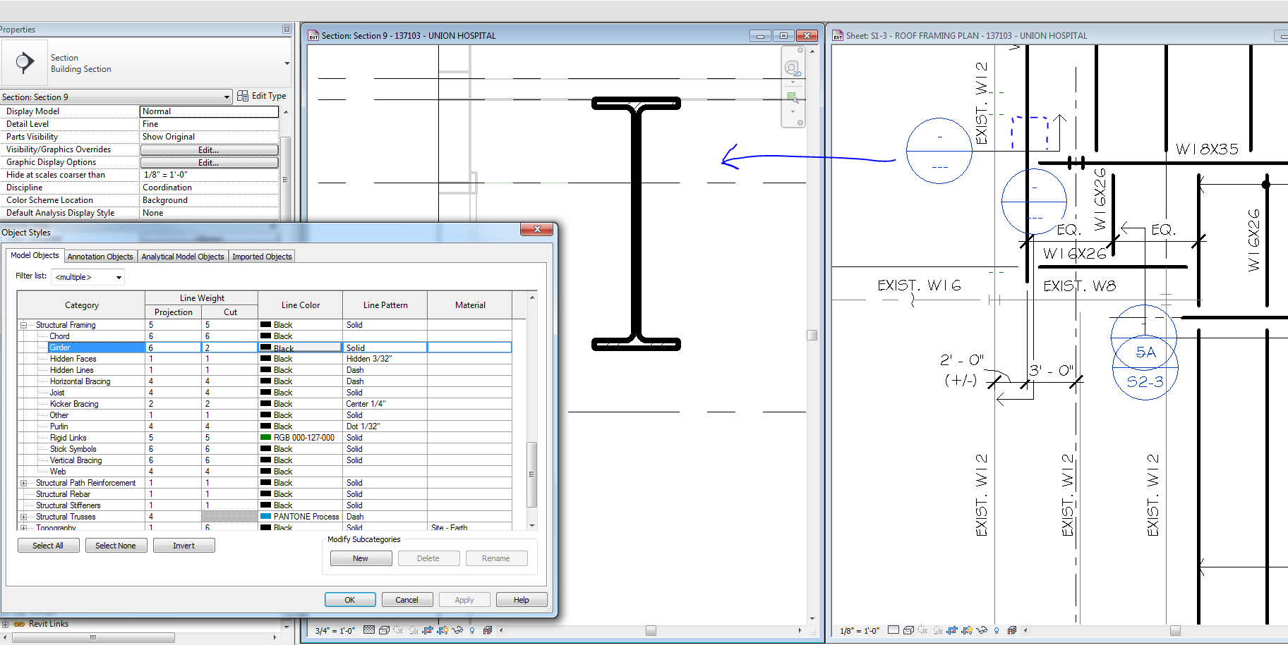 I am attempting to set up some office standards, and I have updated the object styles in our template to make elements to look how we'd like them to look in plan. My problem is that - for girders for example - I have the cut and projection lines set to 6 to have them show up very heavy in plan. When I cut a section, though, the girder outline is now way to heavy. I tried changing the "cut" line weight so that it would be lighter when cut in section (even though this wouldn't necessarily solve my problem, as sometimes section cuts also show a projection of perpendicular beams framing into the side of cut beams, and I'd want those both to look the same). However - changing the "Cut" lineweight in object styles appears to have no effect on the girder in my section cut (which I don't understand - I would think that updating "Cut" lineweight from 6 to, say, 2, my section would be update and show the girder outline with a lighter lineweight??).