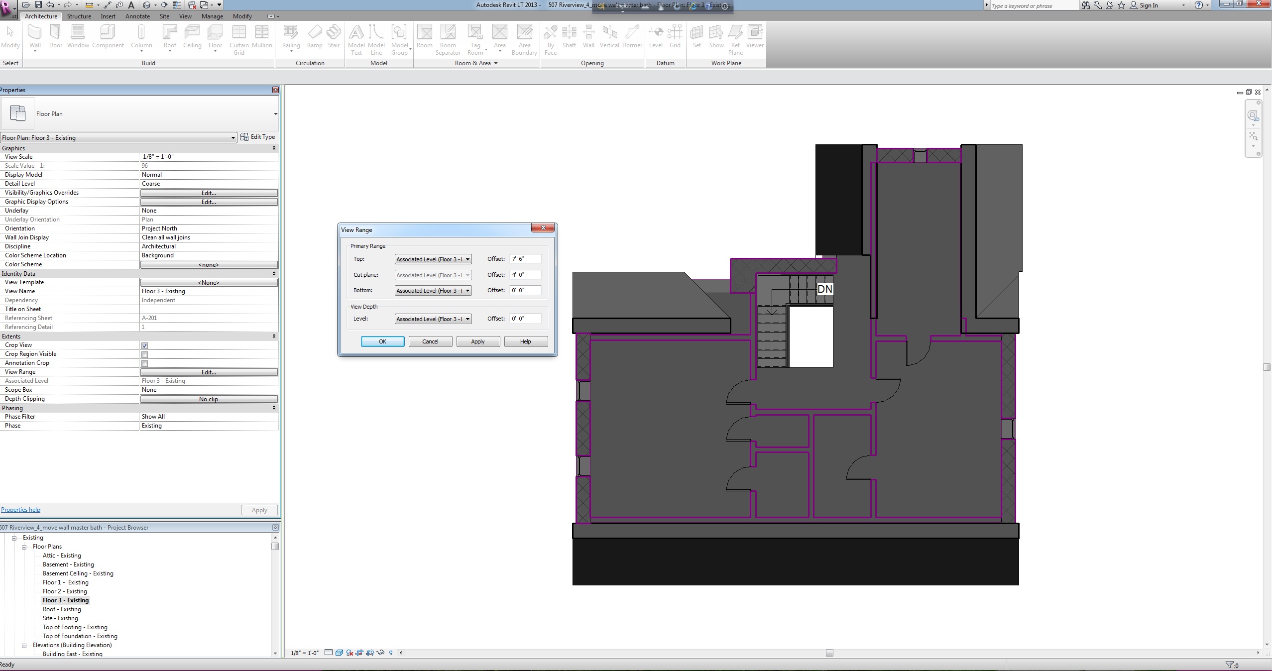I'm using Revit LT 2013 and working on my first model. I'm not sure why the third floor of my model is grey. I don't believe my cut plane is cutting through the floor object (I moved the offset up and down just to see if anything changed, and nothing happened). The model display style is shaded, but that is the same as on the second floor, which shows up normally. If I go to wireframe for model display style, then the floor is not shaded, but I'm not sure why the floor would be showing up as shaded if the I'm attaching a couple of screen shots of the second floor and the third floor with some of the options opened.