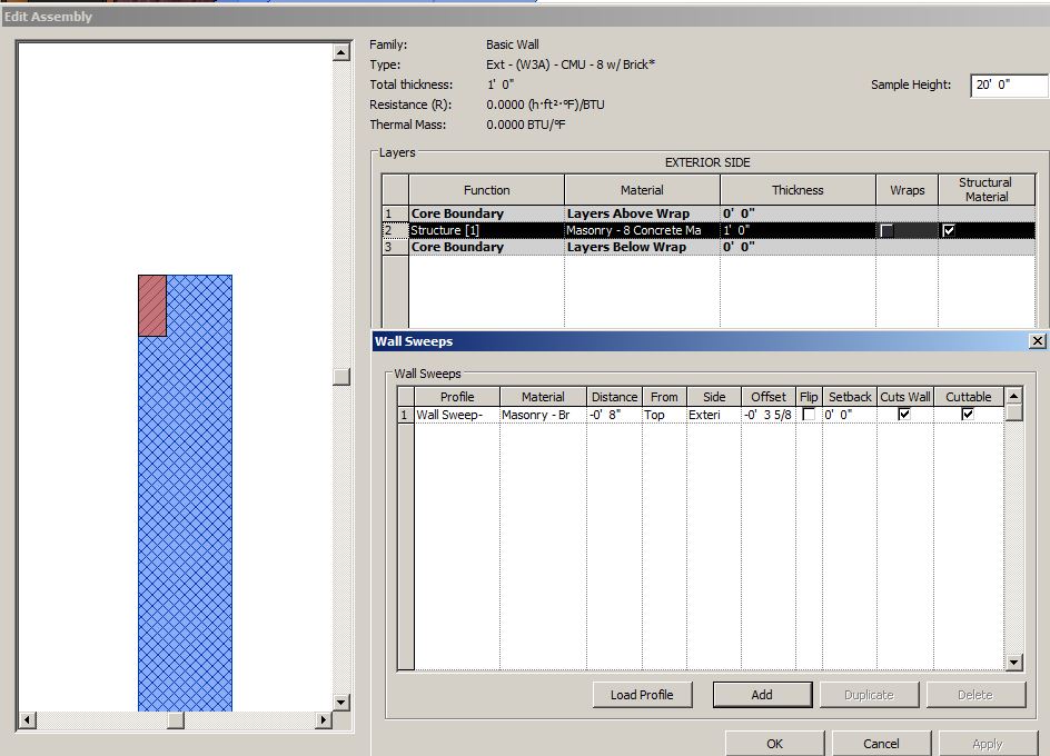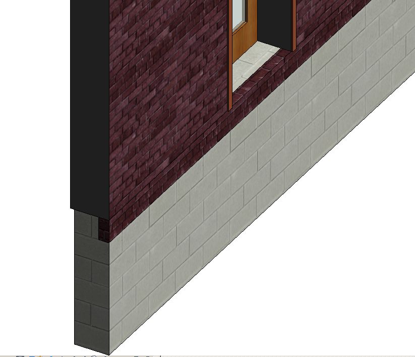 I've got a small scale house project that I'm doing that is rather simple in the modeling aspect so I thought I'd try a few things I normally don't tend to model or would normally just cover somewhere else in the contract documents. Anyhow, I've divided my exterior wall into parts to give it a try for once and everything has went fairly smooth along with knowledge I've gained from this site and around the net. I have however just ran into a problem that I've yet to solve. Hopefully something easy that I'm overlooking but you just never know do you? Once dividing the exterior wall into parts I have pulled the brick ledge down to the top of the 12" cmu and all is well with the exception of the door areas. How do I get the brick below the door. I'm sure one could just draw a small brick only wall underneath and then join geometry but I'm thinking there is probably a proper way to do this that I'm not aware of. I cant seem to find anywhere to edit the wall profile once I've parted out the wall? Any advice on how you guys attack this would be appreciated. Please see the attached image for a visual.