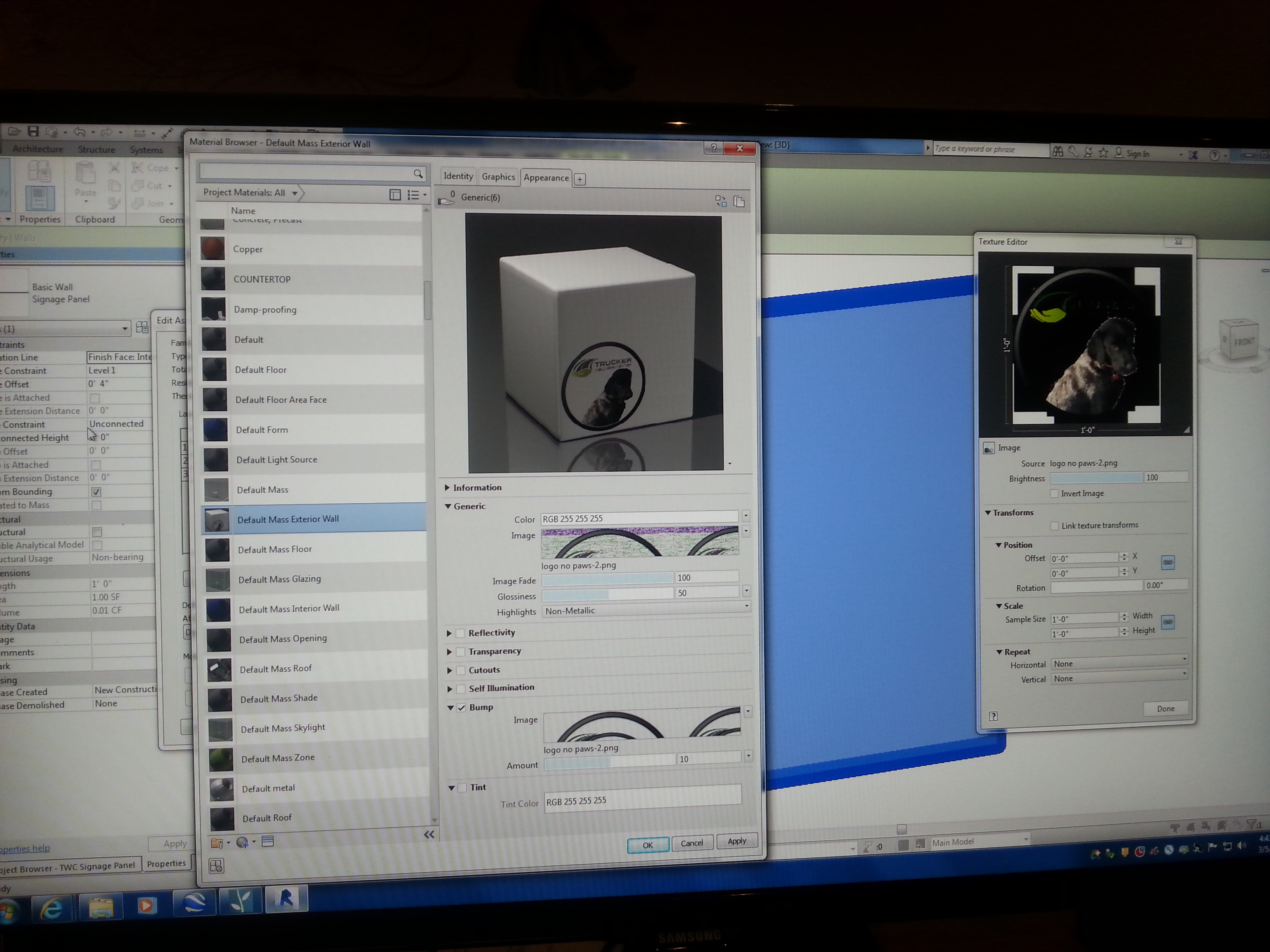 Good morning all. I'm using Revit 2015 and am trying to add a logo as a material so I can add it to a wall panel. I need it as a material and not as a decal for importing it to another program for rendering. When I add the image, it shows up correctly in the preview, but then it messes up the image (reverses the white to black and pixelates the edges of the image) in the texture editor. I've spent over 4 hours trying everything I can think of to fix this, and am now relying on those with more knowledge to help me. See attached image for reference. FYI the logo is in .png format so I can have transparency within the logo so it reads accurately on the wall panel. Any/all help is GREATLY appreciated! Thanks in advance! - Brian