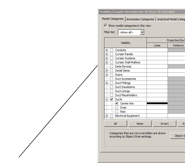 I've build a model in exisisting construction, demolished some of it and then rebuild a new area. After that i made ventilation on one floor and i dont know at what point, but now i got a lone line from the middle og my building stretching way out. I cant remove or delete it, i cant even select it. I have tryed to select the whole building but nothing seems to help. The line is also only shown in new construction phases.