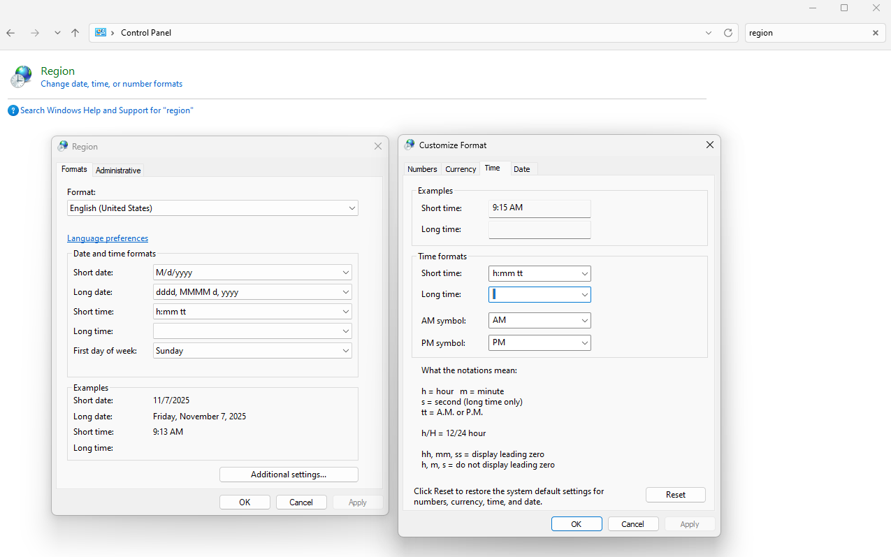 Go to old school control panel, type region (should say Change date, time, or number formats)