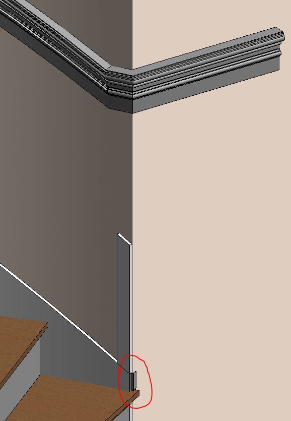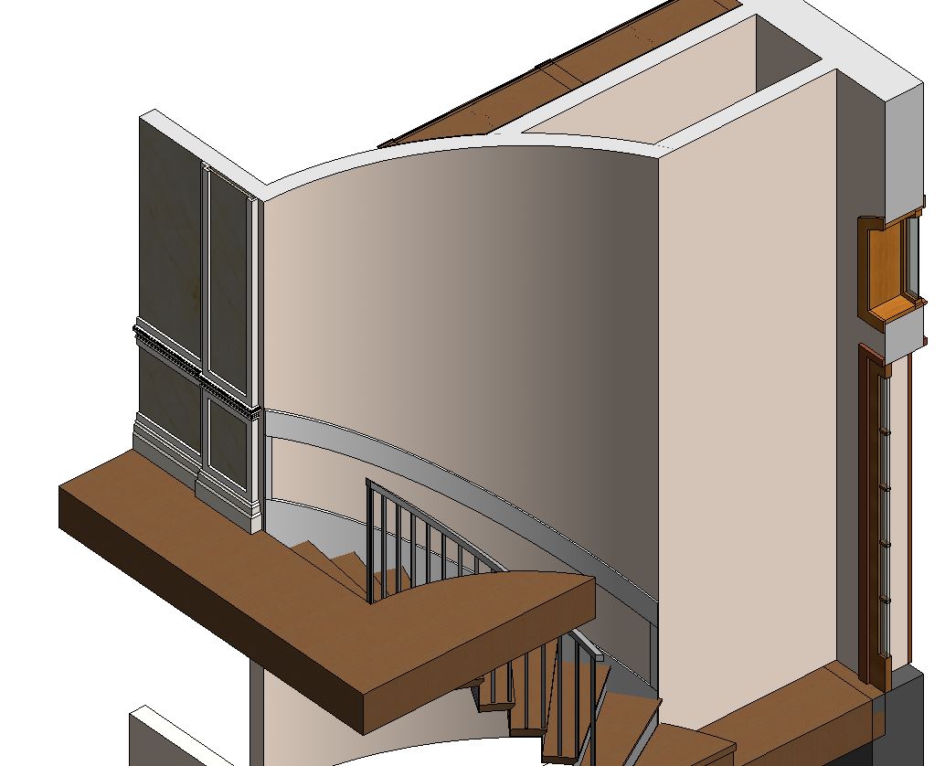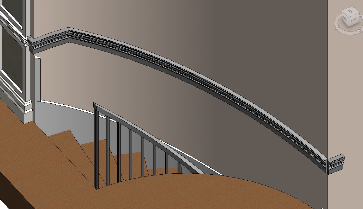 And now I'm having a hard time trying to make wall panels (wainscoting) in this curved wall, just as the other wall at the left, but without the colums. How can I achieve that in this curved wall, also going up with the stair. Any Help please will be greatly appreciate. Thanks!!