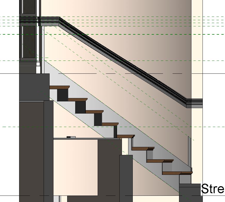 @3. It’s because you have that horizontal piece at top. It’s a geometry thing, not Revit. Make the rail to follow the path of the stringer as close as possible. If you need this horizontal piece at top, you can adjust the height of the lower horizontal segment (see my previous pic.), select rail->edit path->select lower flat piece->height correction (options bar)->custom->give it a value - I let you figure it out