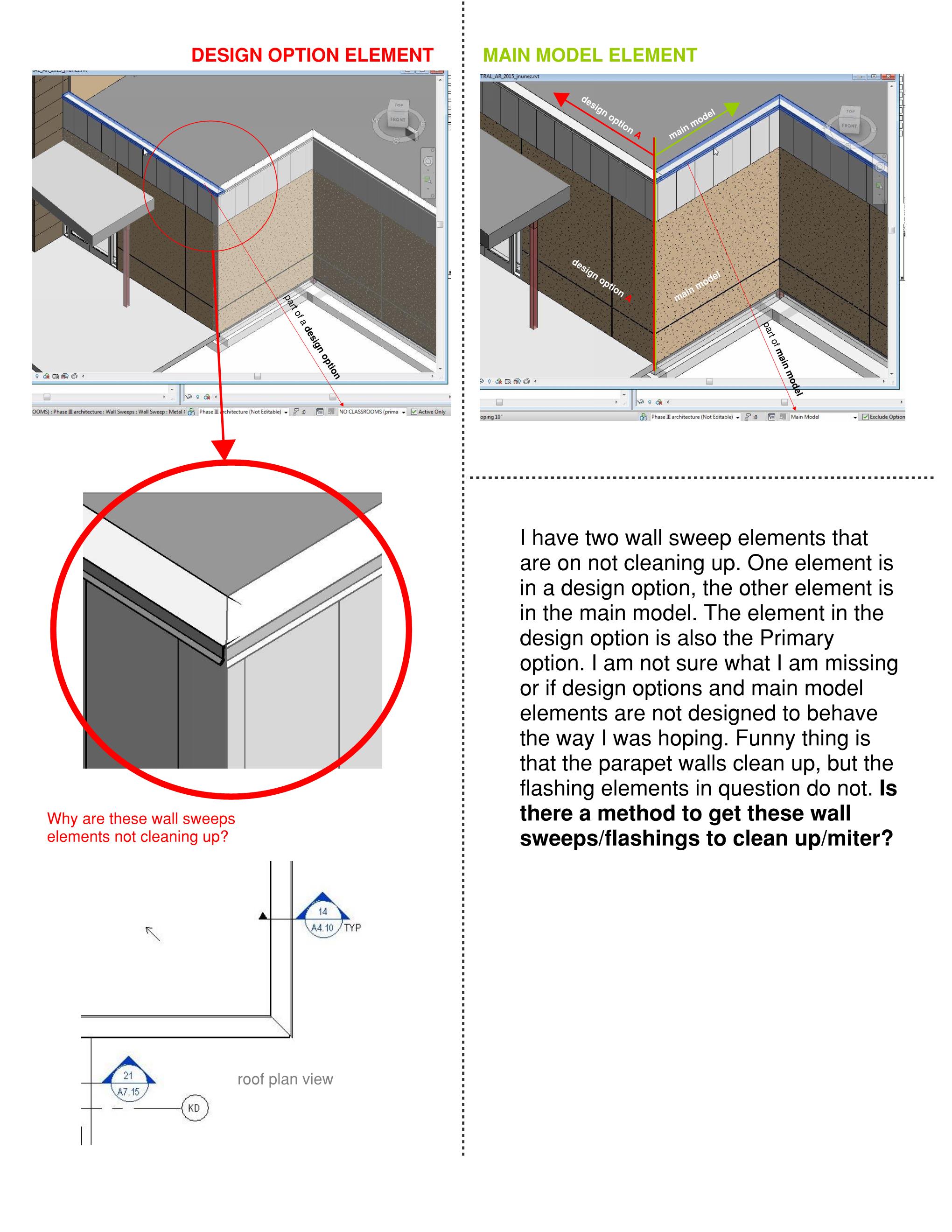 I have two wall sweep elements that are on not cleaning up. One element is in a design option, the other element is in the main model. The element in the design option is also the Primary option. I am not sure what I am missing or if design options and main model elements are not designed to behave the way I was hoping. Funny thing is that the parapet walls clean up, but the flashing elements in question do not. Is there a method to get these wall sweeps/flashings to clean up/miter? See Attachment.