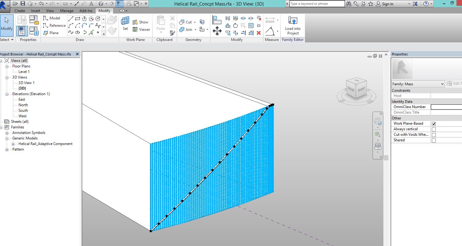 This is my first post. I'm using Revit Arch. 2015. I have created a helical handrail as an adaptive component. See pic attached. The stair is one story, curves only slightly and has a 62' radius so it covers only about 13 degrees of arc. I did this following this video: "How to create [a] Helix in Revit using adaptive component" https://www.youtube.com/watch?v=8XNnlx1yhbg.