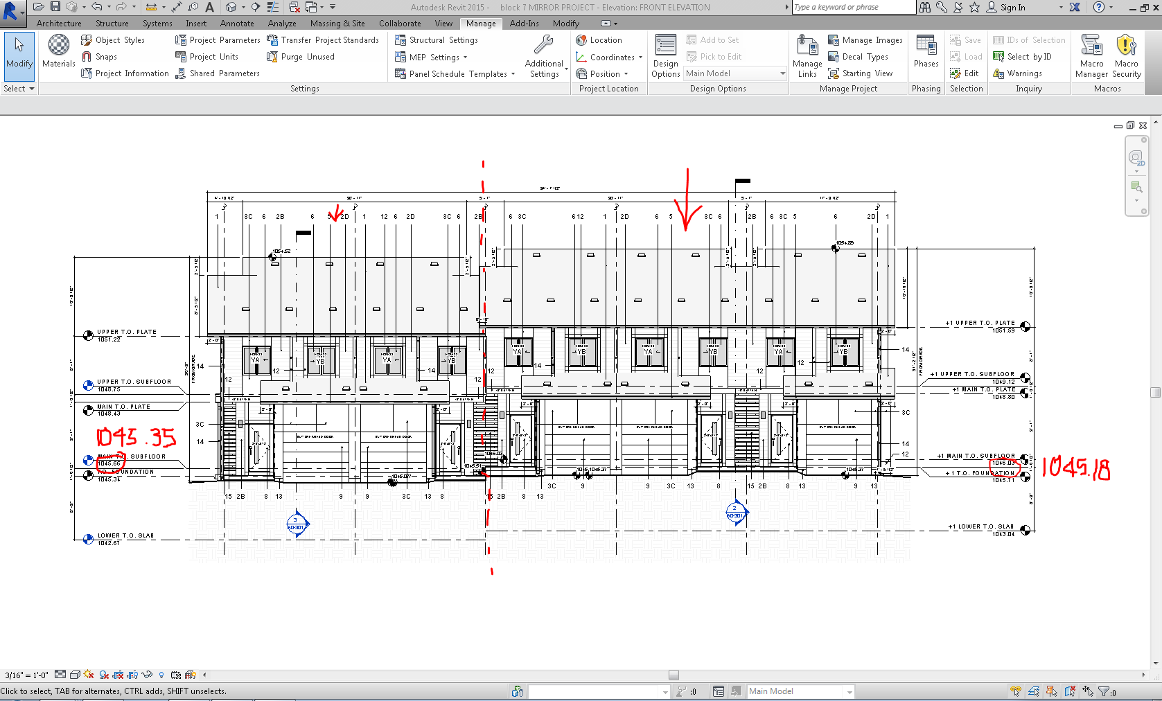I am trying to move my entire project down to get the correct grade points for my main floors. This townhouse is the perfect mirror of another project on the same site, and i've already successfully use the "Mirror Project" to mirror the entire project. Now my issue is that I need the Main T.O. Subfloor (notice there are two different ones) to match what we have on our site plans.