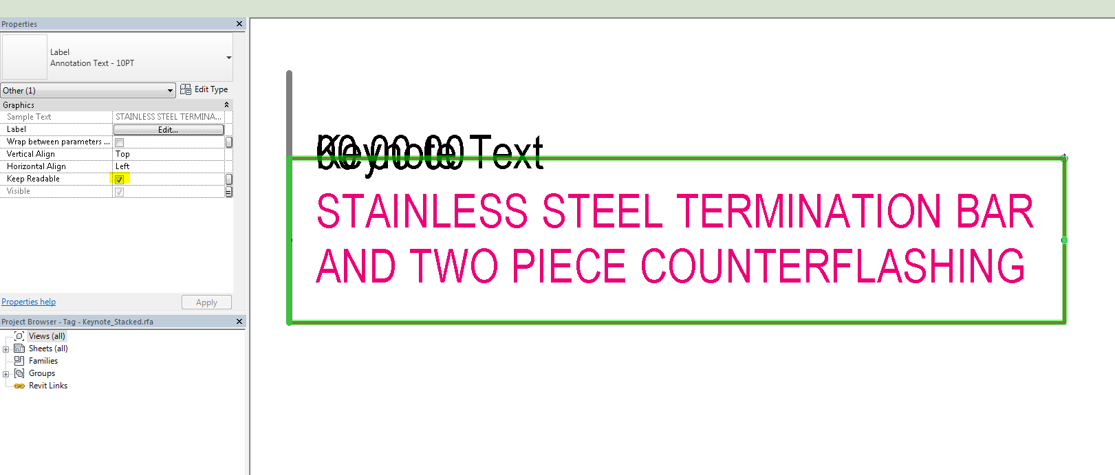 I'm probably missing something dumb, but I'm having a problem where revit is not obeying the "Keep Readable" parameter from a label in keynote family. Why is this little guy not doing what it's told? Thanks.