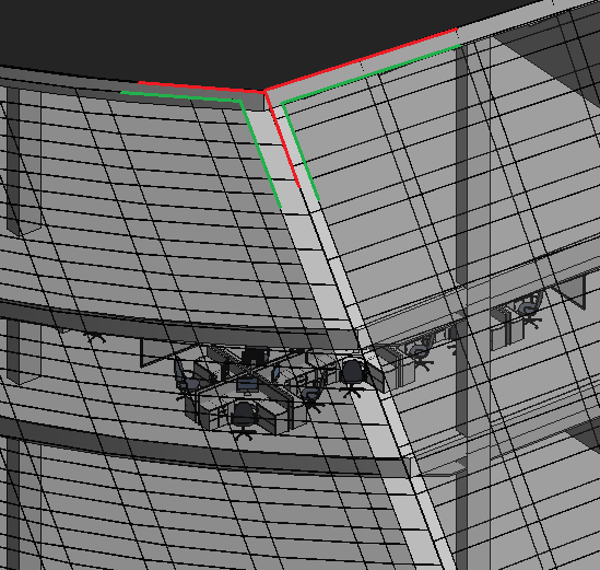 This is where I run in to trouble. As seen on the picture, the original Curtain System is marked in RED, and the offset Curtain System in GREEN. I can't use the tool "Join", because they are not drawn as regular walls.