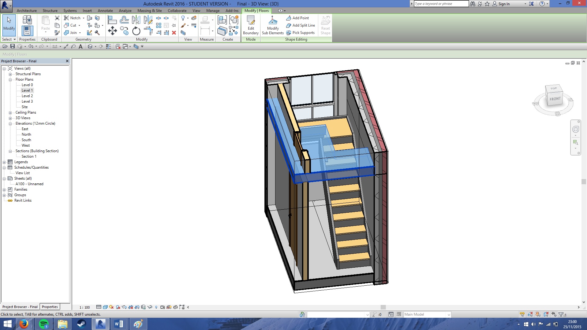 The problem is when I try to select the floor there is some sort of error, it does not show one but the floor does not become transparent It becomes slightly blue but still brings up the correct options for editing the floor. I can therefore not see the correct size of the cut needed because the stairs below are hidden behind the floor.