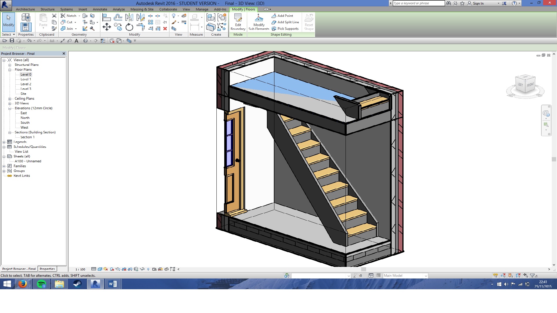 I am modelling my own domestic residence for a university project and seem to have hit somewhat of a roadblock. I am trying to cut into the floor of my second level in order to make way for the entrance to the staircase. As you can see in the second picture I have done this successfully for the floor above.