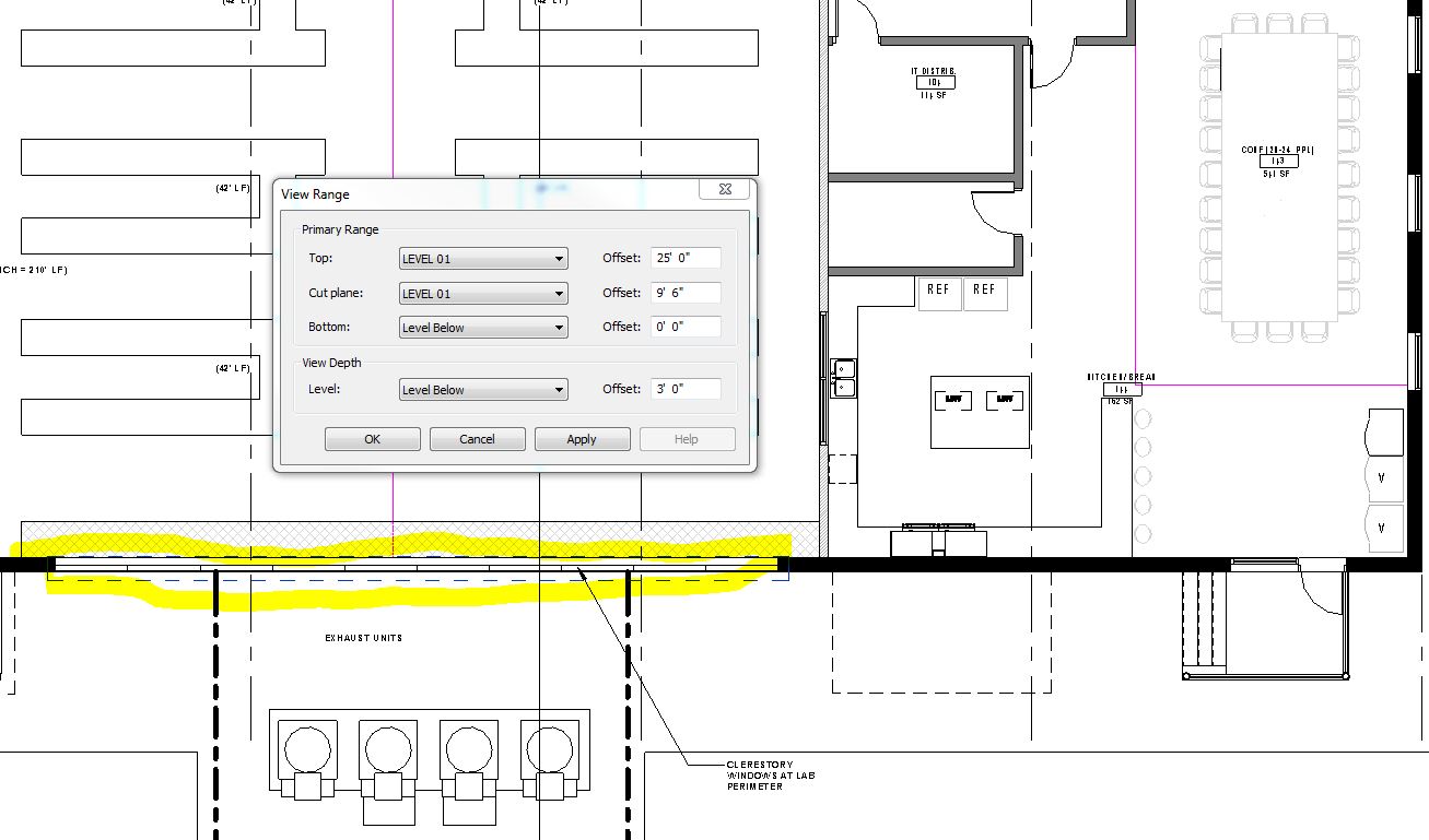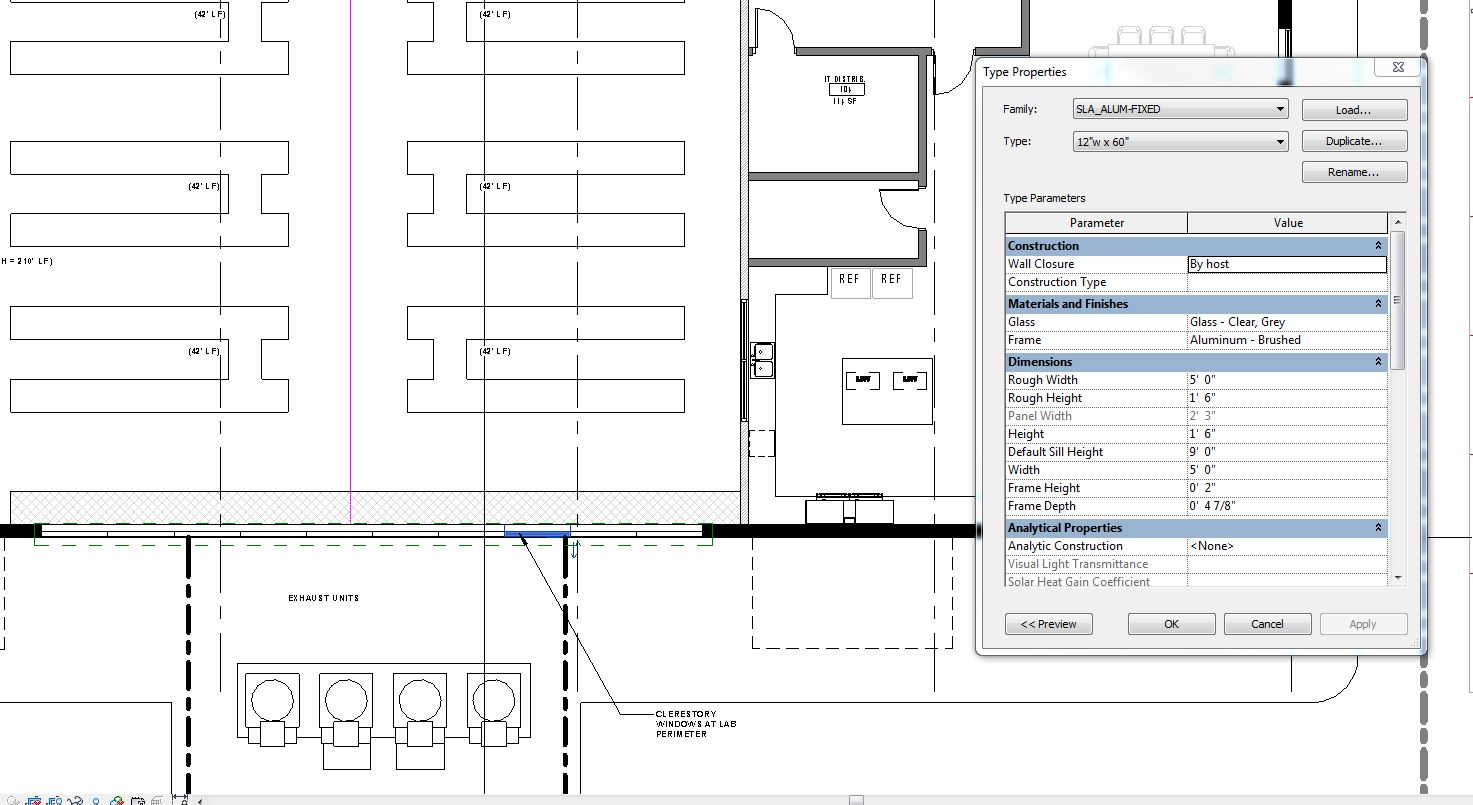 Hello! I'm having some issues with a window family currently. (see screenshot) The window on the right (next to the door) is the same exact family as the windows on the left (with the plan region box around it). Sill height of right window is at 2'-0", left window sill height is at 9'-0" (1'-6" h). Plan region is cutting at 9'-6" (we've tried all kinds of dif scenarios with adjusting visibility/view range/etc. where it's cutting the transom window on the left and still to no avail with getting it to properly show the section cut of the window). Cannot figure out why the left windows are not reading the same as the right even with the proper cut levels established. I've attached the family if that helps. Thanks in advance!