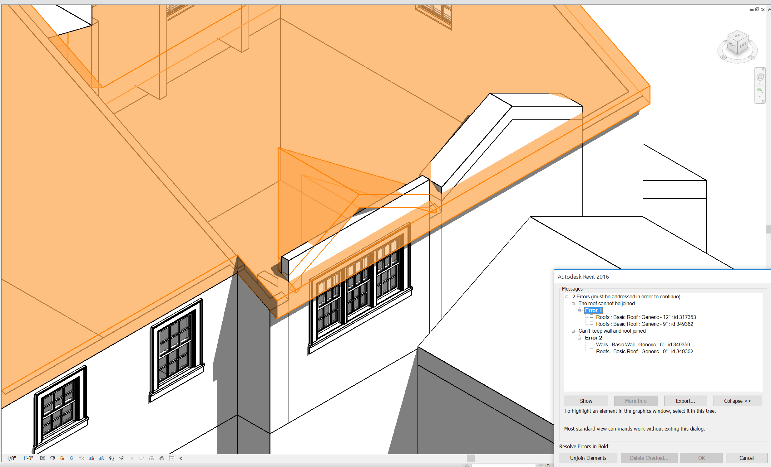 Trying to extend dormer roof to main roof - but having trouble with errors.