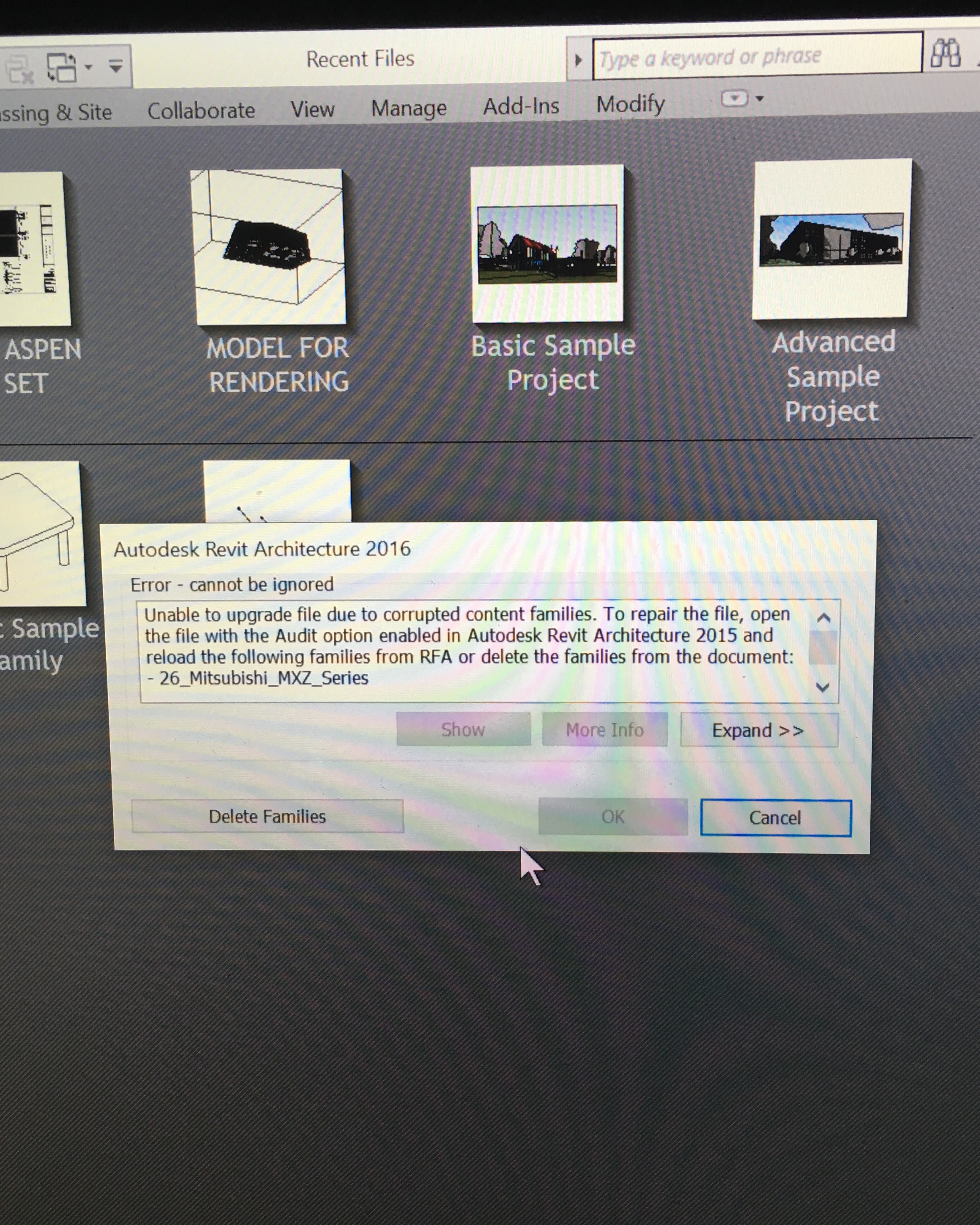 "unable to upgrade file due to corrupted families. to repair the file, open the file with the audit option enabled in autodesk revitarchitecture 2015 and reload the following families from RFA or delete the families from the document:-26_mitsubishi_MXZ_series-26_mitsubishi_SEZ_series"